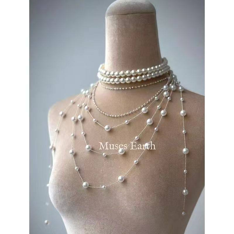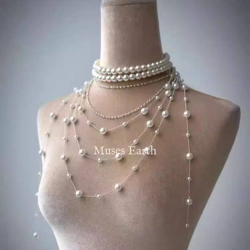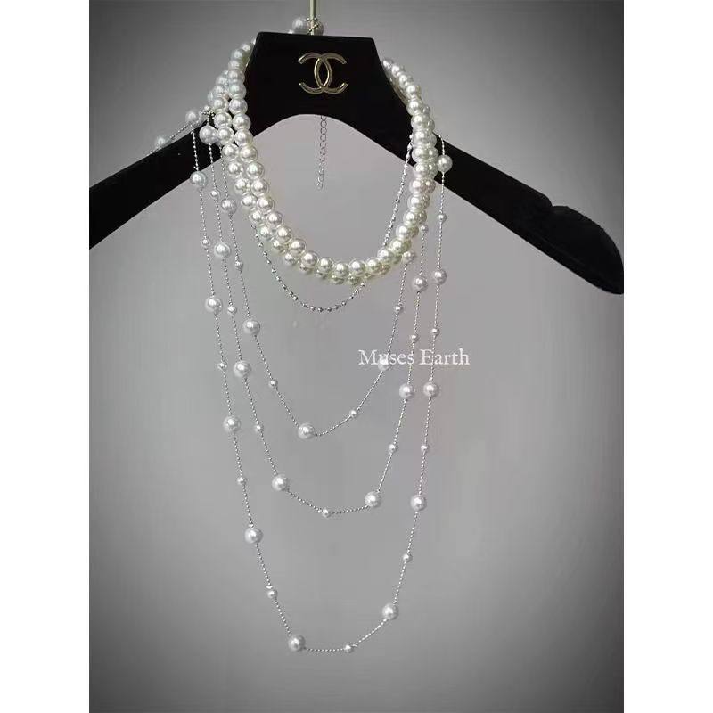 2025新款轻奢叠戴项链满天星长款珍珠串珠流苏毛衣链小众设计颈链
