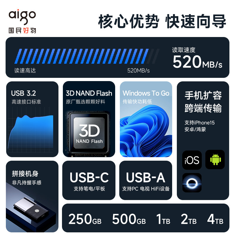 爱国者移动固态硬盘2t大容量高速电脑苹果手机外接SSD移动硬盘1tb