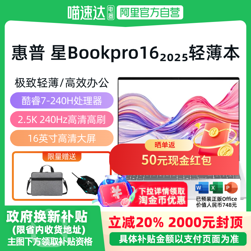 【政府至高补贴20%】HP/惠普 星Book Pro 16 2025新款16英寸酷睿7-240H轻薄笔记本流畅办公学生编程官方正品