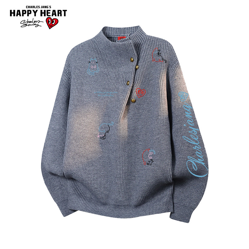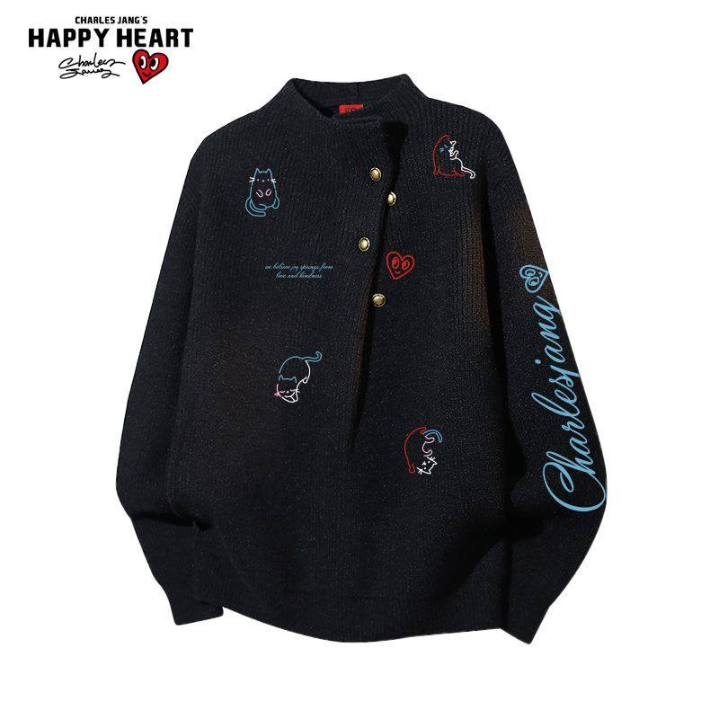 查尔斯桃心小猫印花半高领针织衫上衣男冬季新款休闲保暖情侣毛衣