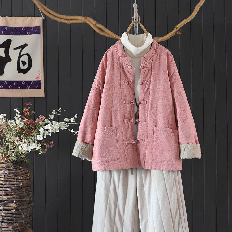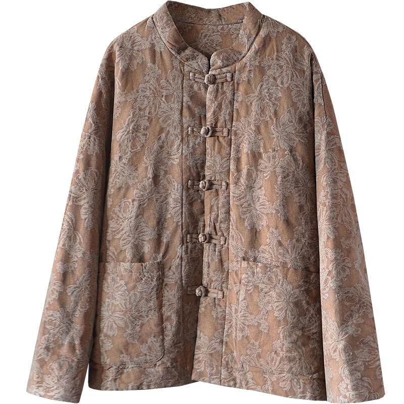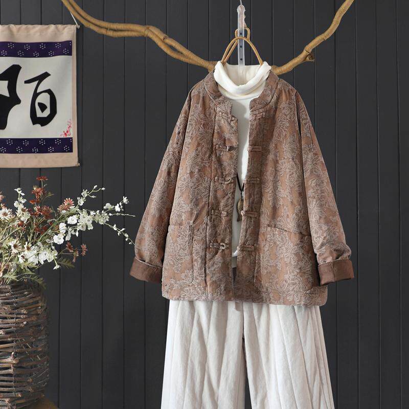 冬季暗纹提花夹棉加厚亚麻外套女士棉衣宽松慵懒复古盘扣棉服棉袄