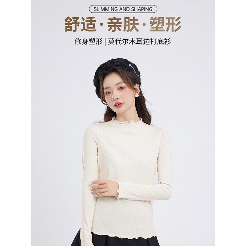KV真维斯咖色木耳边打底衫女2025新款春秋季修身长袖时尚百搭上衣