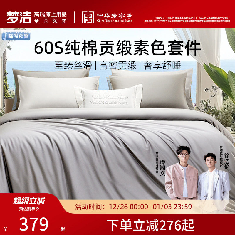 梦洁60S全棉纯棉100三四件套床单被套件枕头轻奢贡缎床上用品