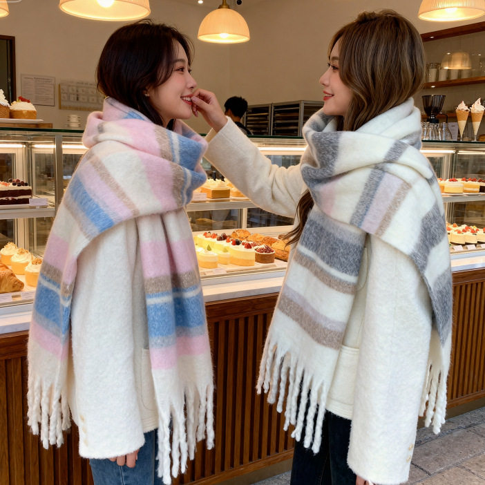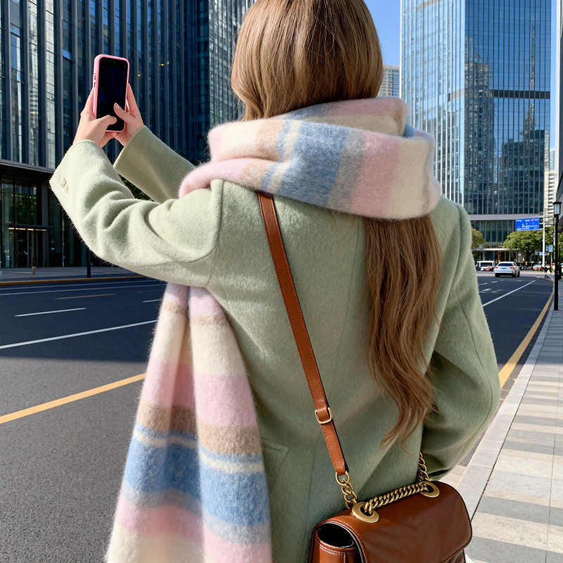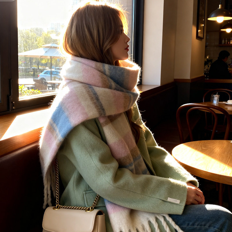 韩版高级拼色保暖加厚学生长款披肩秋冬彩色马海毛围巾女