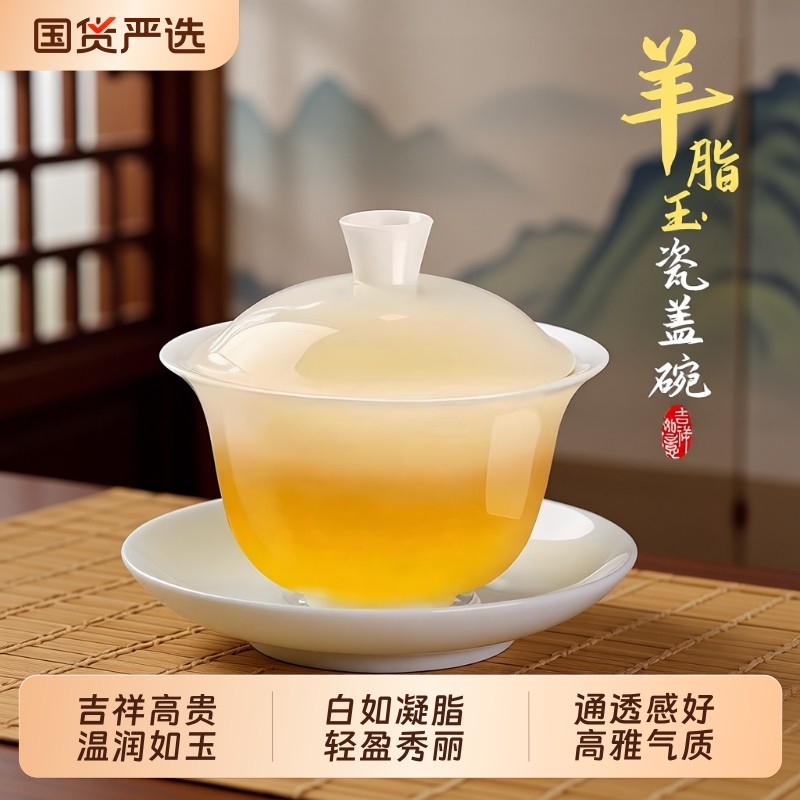 羊脂玉盖碗茶杯德化白瓷茶碗陶带盖三才功夫套装家用单个高档茶具