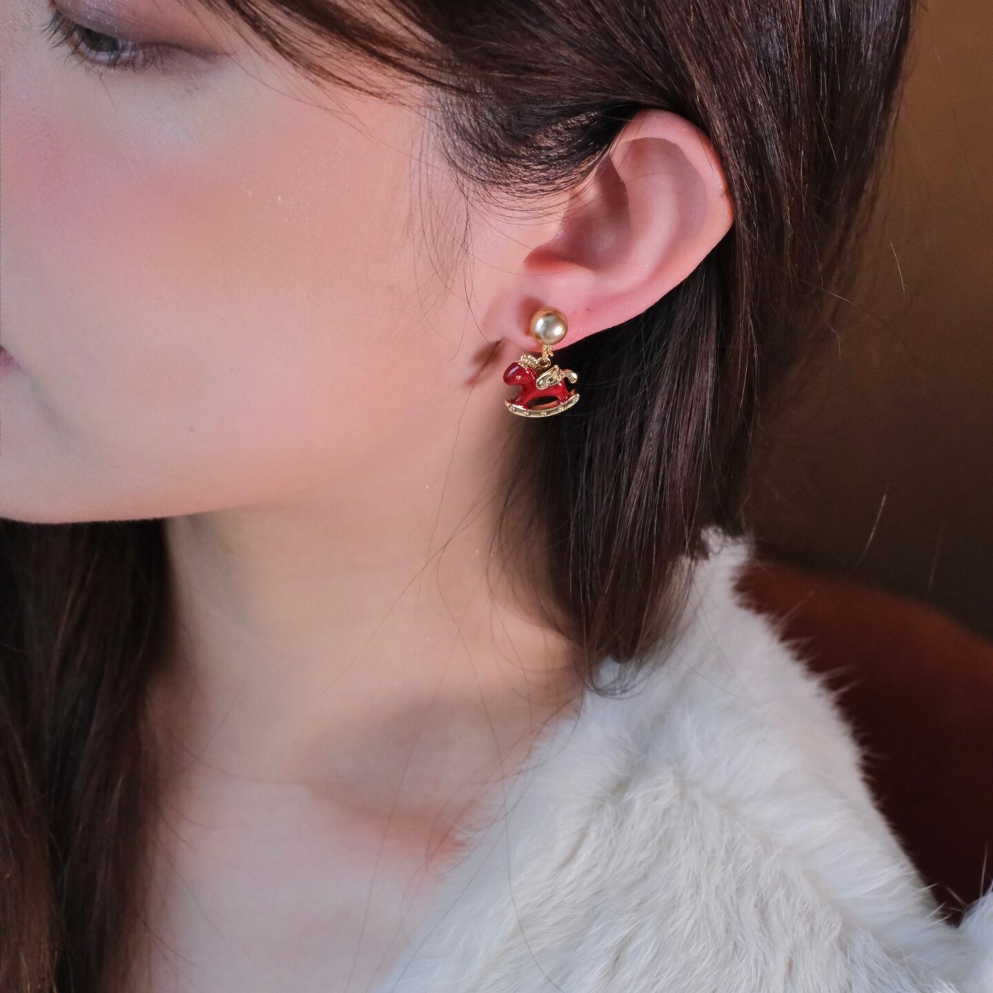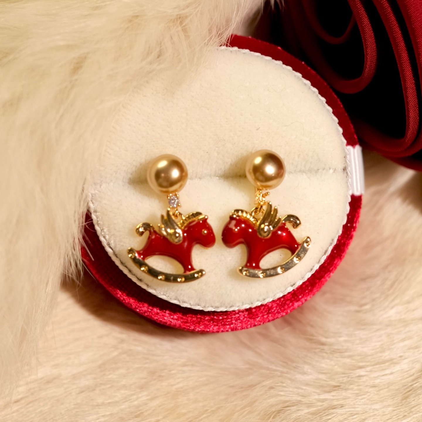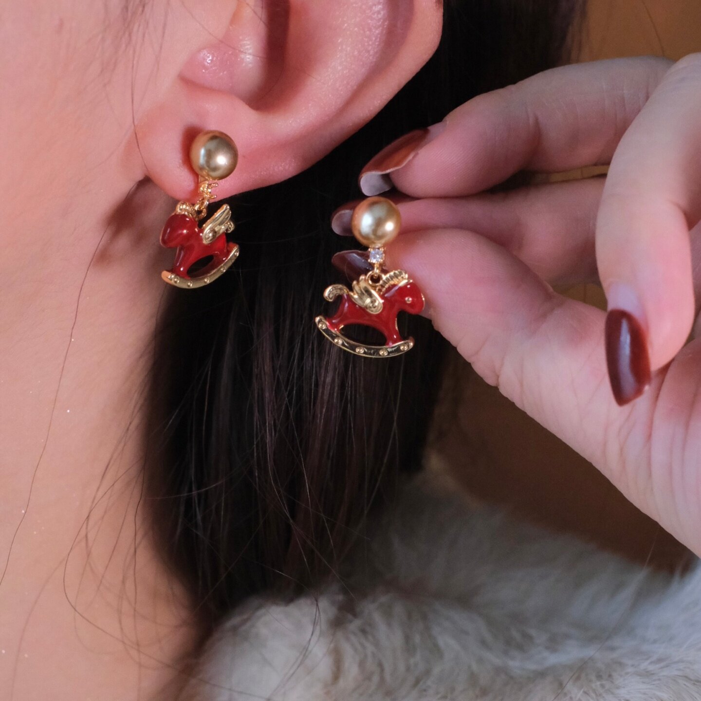 《红运小马》新年氛围感酒红色本命年摇摇马珍珠耳钉耳环耳饰耳坠