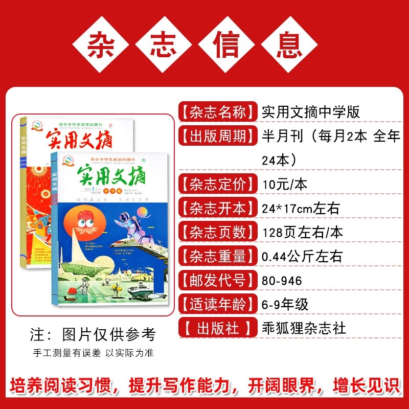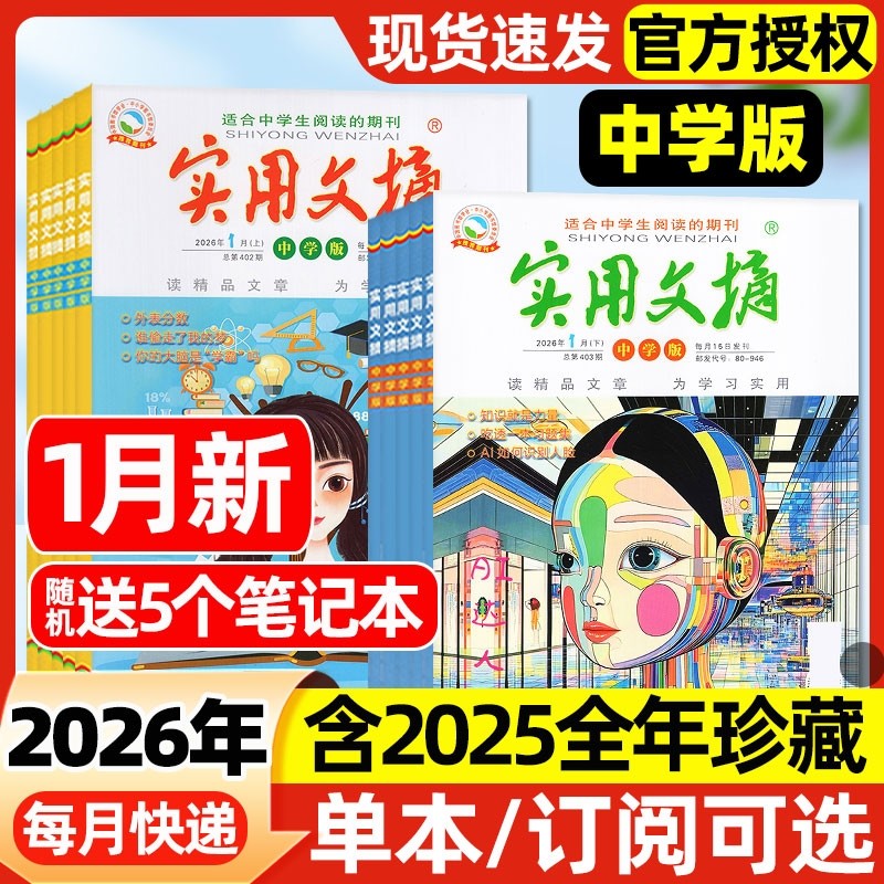 【多期可选】实用文摘中学版初中版杂志2026年1月上下新【全年/半年订阅/2025年1-12月】7-9年级作文素材期刊