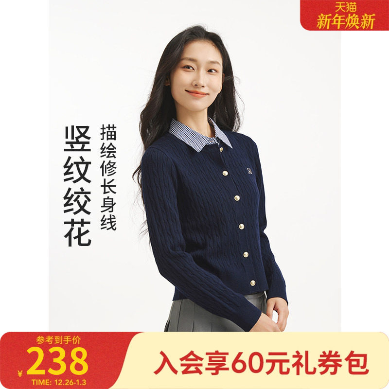 热风针织开衫2025年秋季新款女士修身假两件POLO领细密绞花针织衫