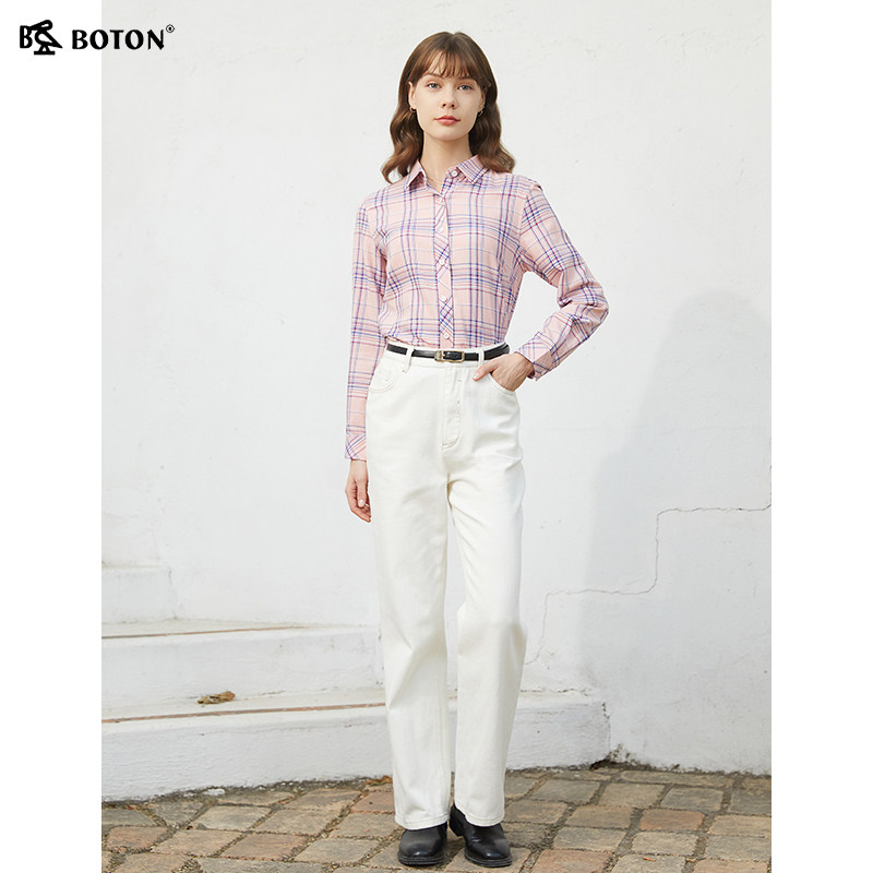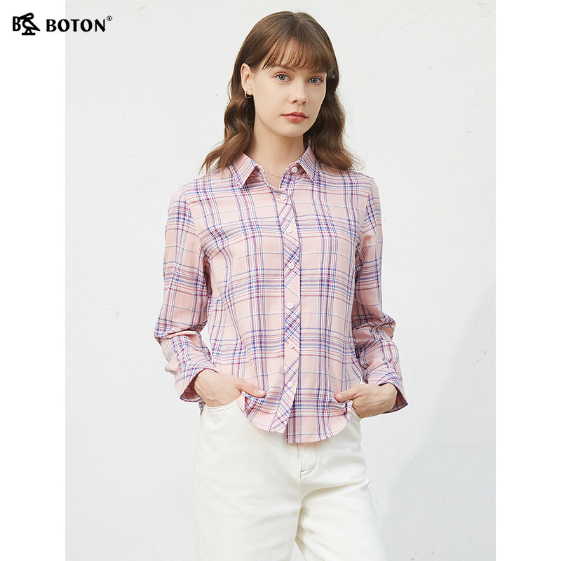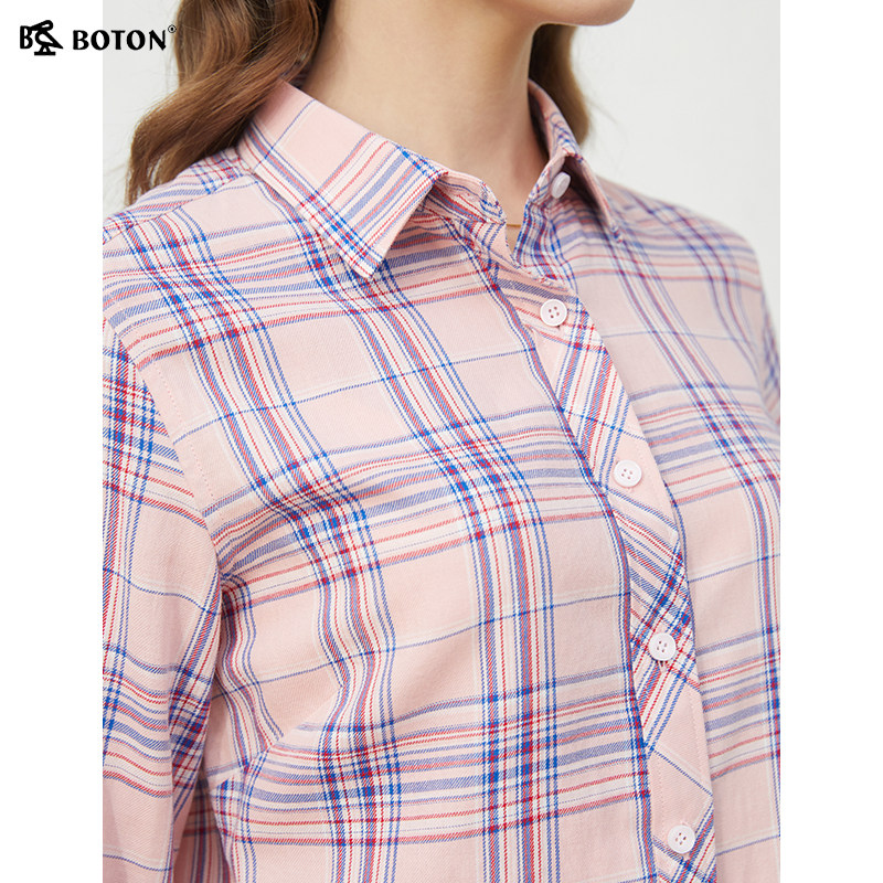 波顿2025春季新款女士粉红色长袖格子衬衫高端美式休闲英伦风衬衣
