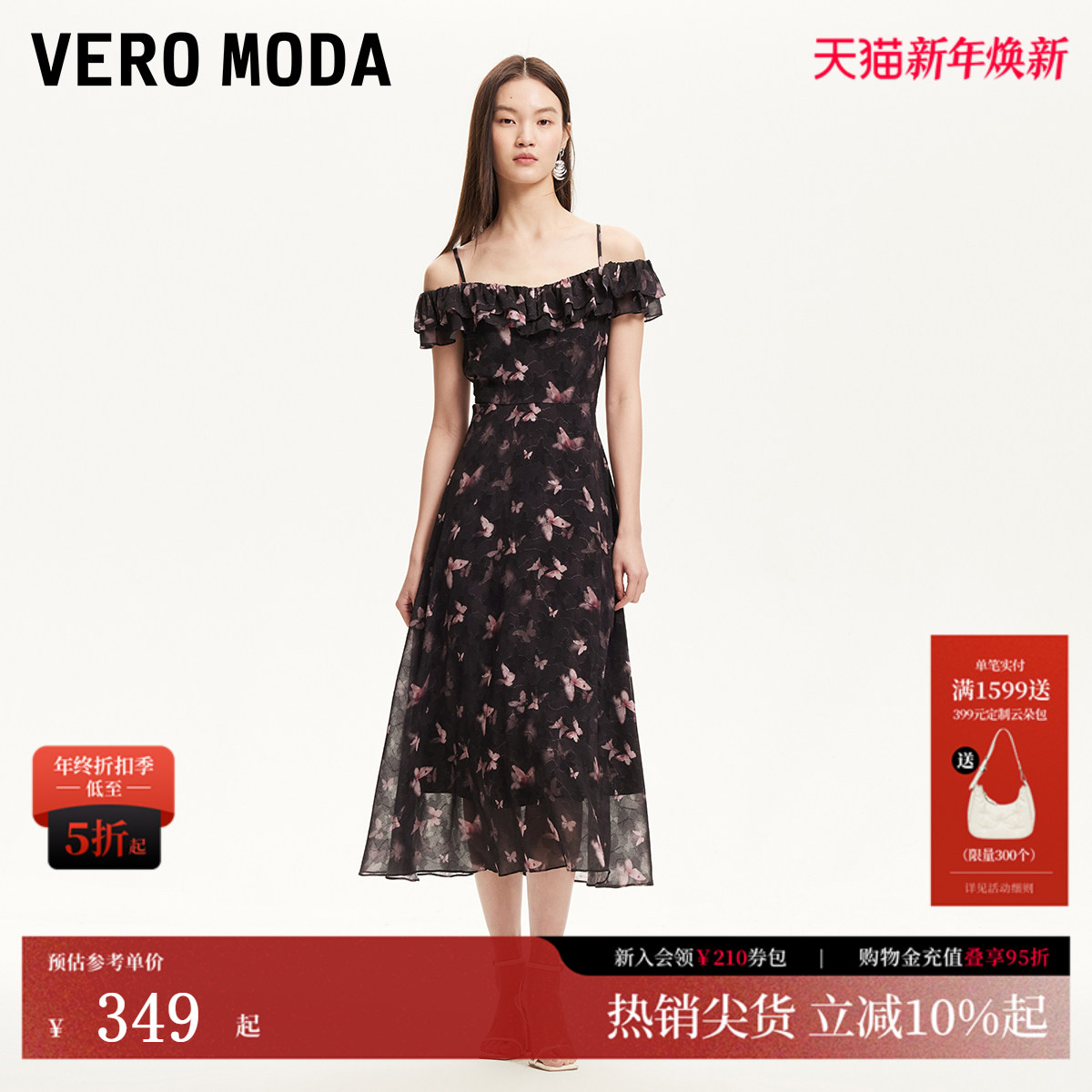 Vero Moda连衣裙2025夏季新款荷叶边蝴蝶印花长款连衣裙甜美优雅