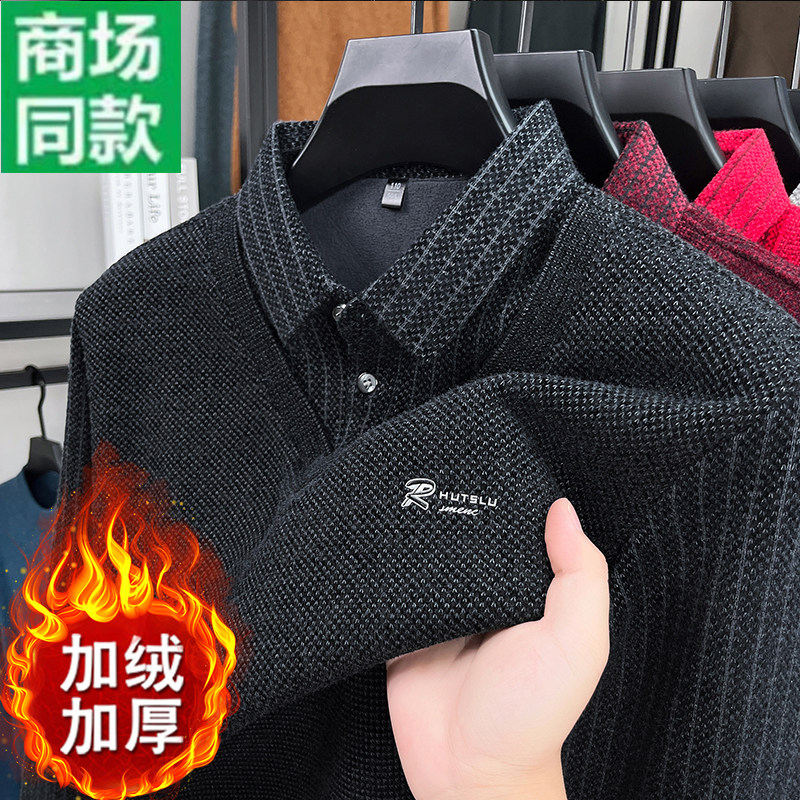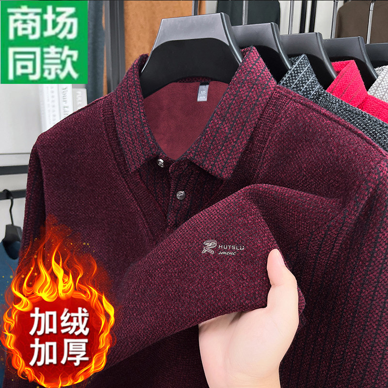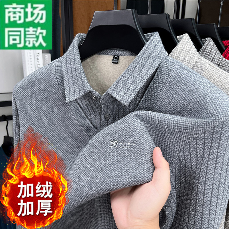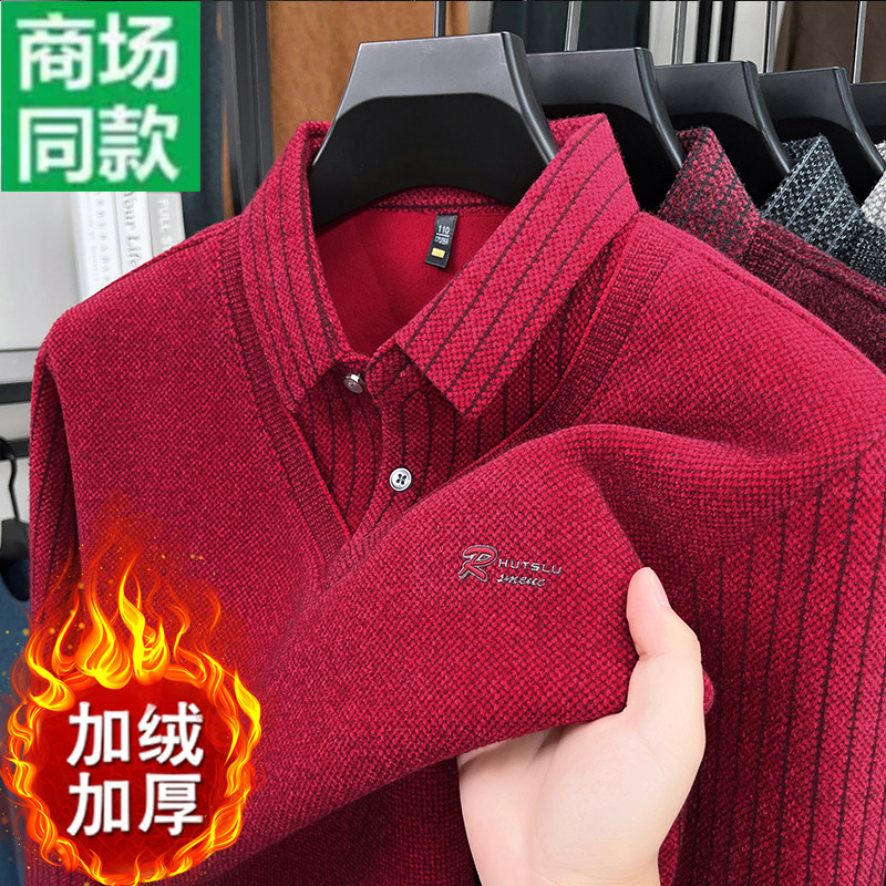 冬季男士假两件加绒加厚毛衣翻领针织保暖中老年POLO打底衫爸爸装