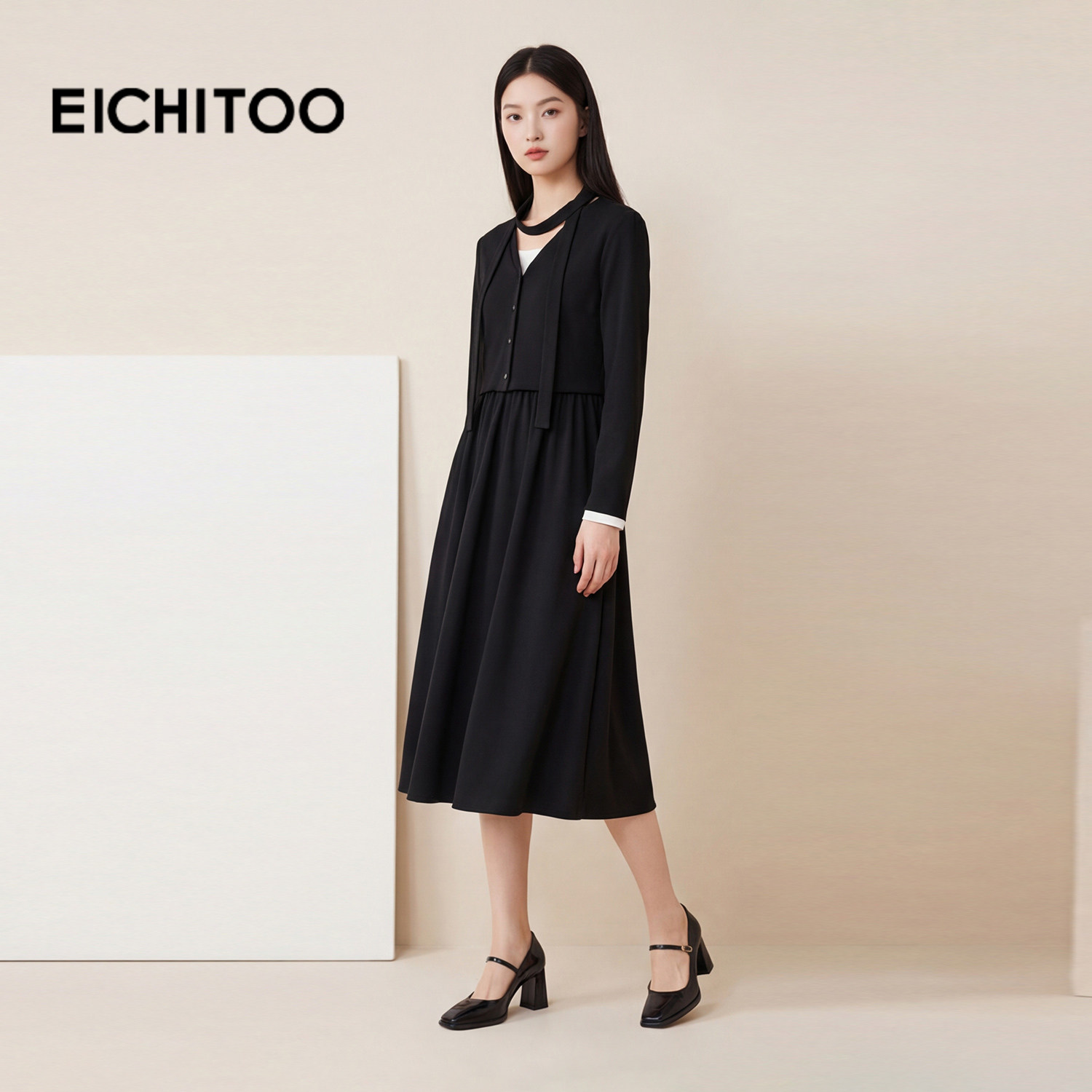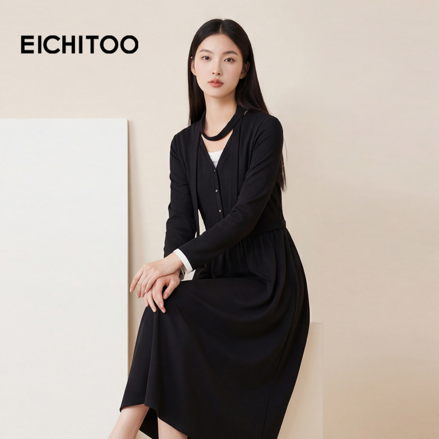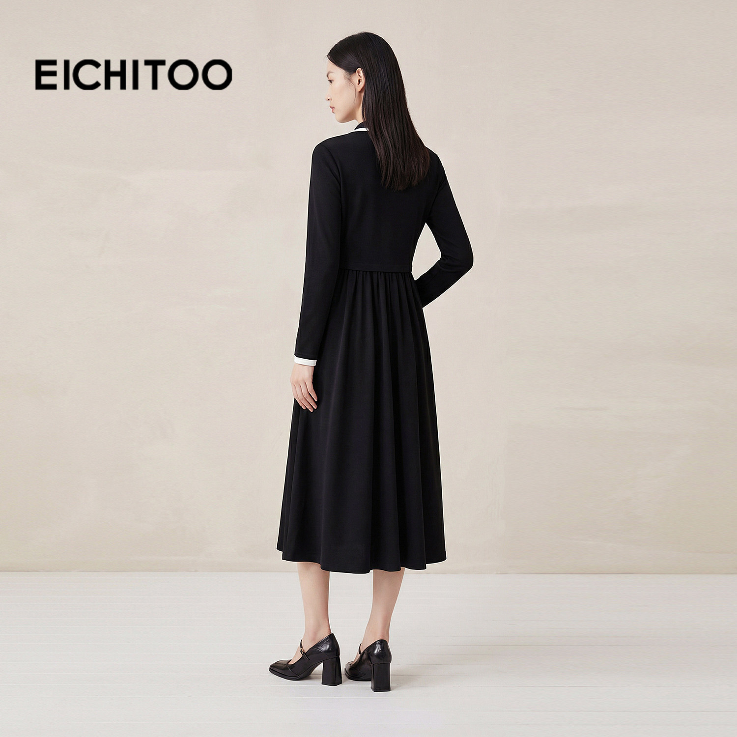 爱居兔时尚两件式连衣裙女春秋新款经典黑白撞色连衣裙套装