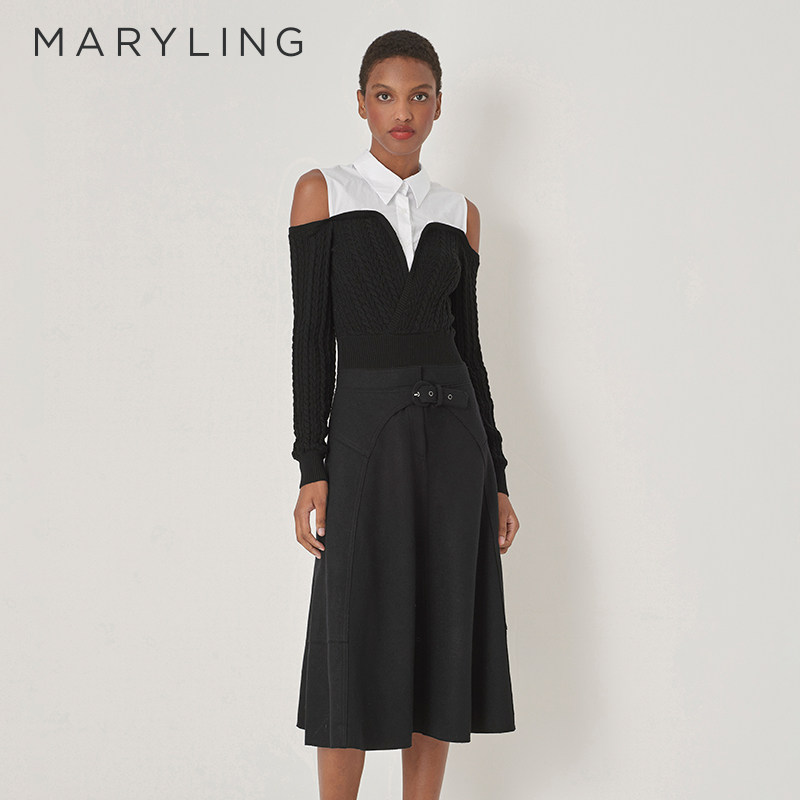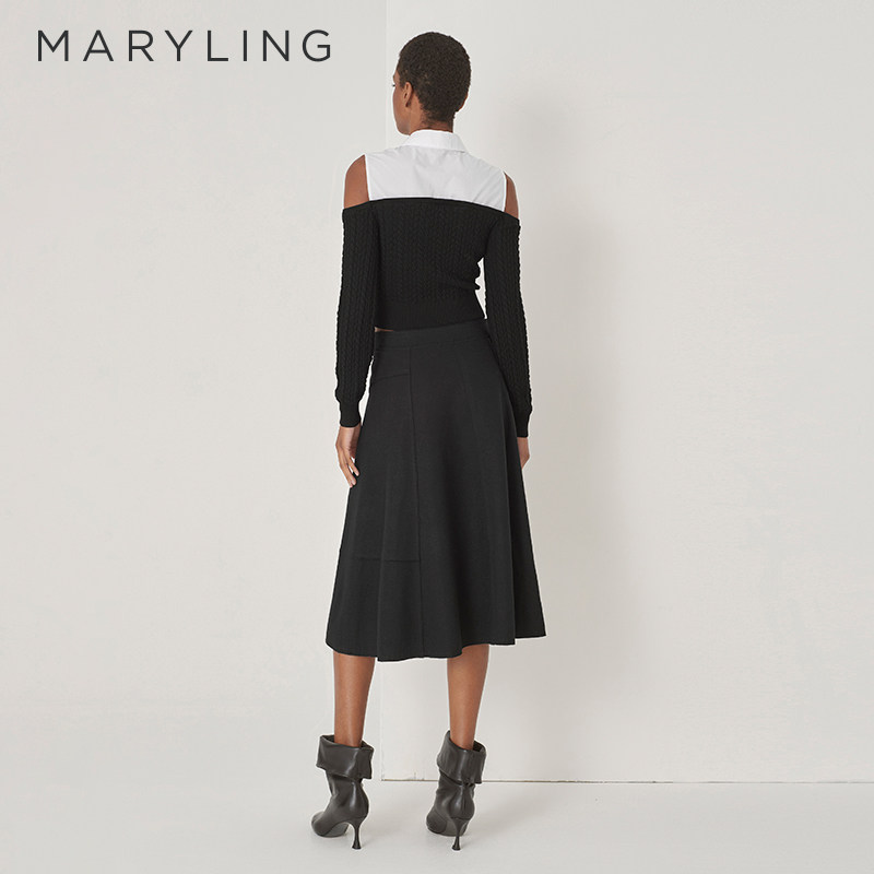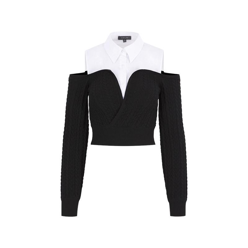 MARYLING玛俪琳秋季新品黑白露肩针梭拼接羊毛上衣A1DGW26420