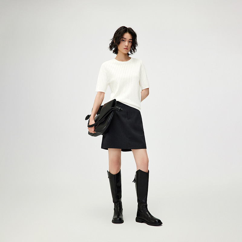 三福长袖上衣2025新款秋季圆领修身针织衫简约纯色内搭打底衫女装