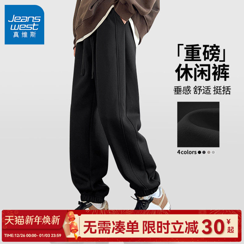 GV真维斯黑色运动裤男加绒裤子男款秋冬季宽松大码男生束脚卫裤C