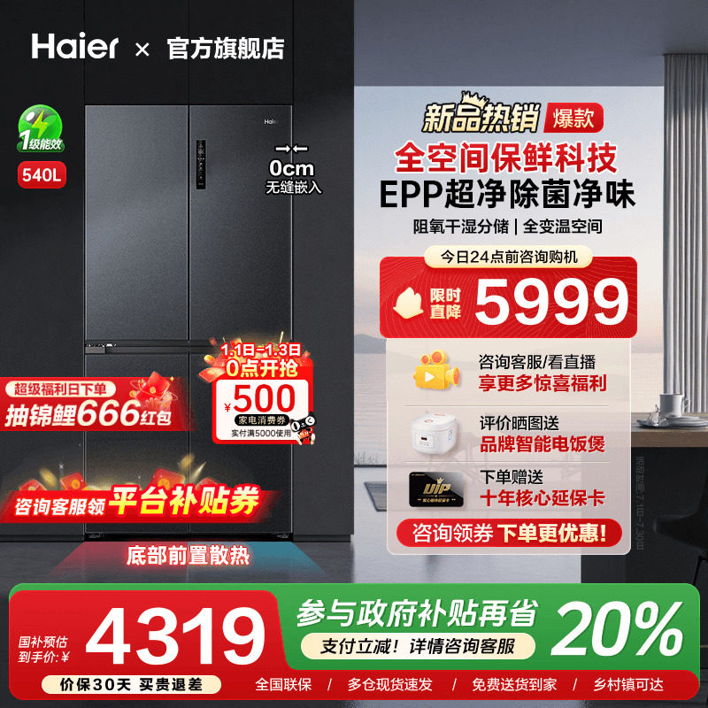 [换新补贴]海尔540L超薄零嵌入式十字双对开四门大容量家用电冰箱
