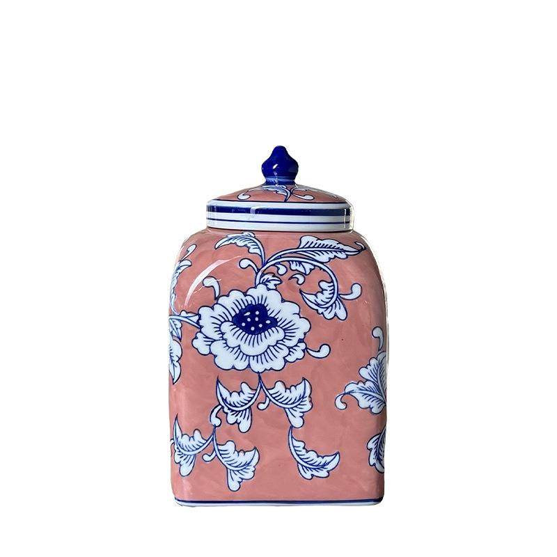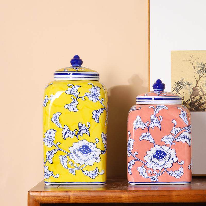 新中式帝王黄色方形储物罐红色陶瓷花瓶轻奢仿真花插花瓶软装饰品