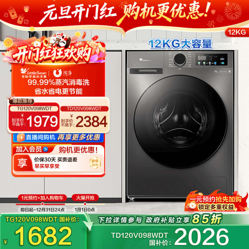 [纯净]小天鹅洗衣机12kg大容量滚筒家用超薄全自动洗脱一体 TG098