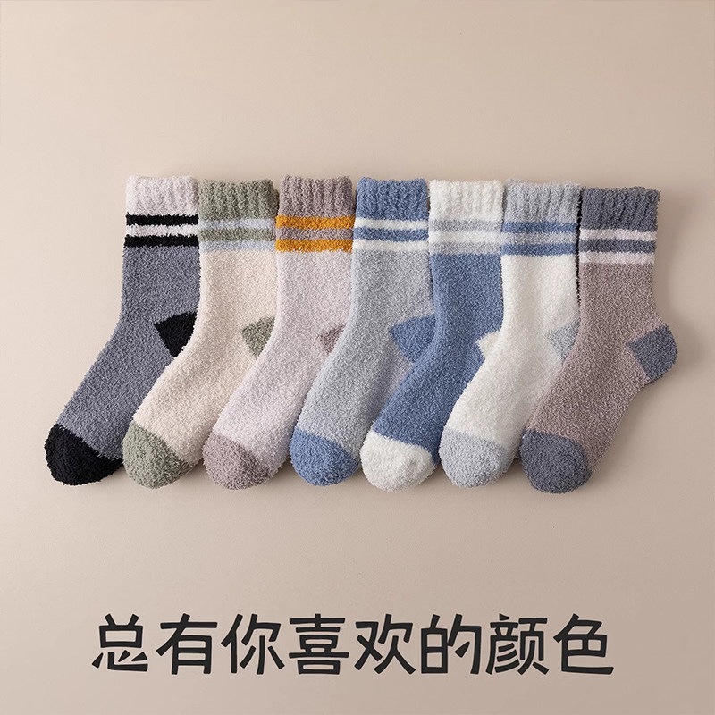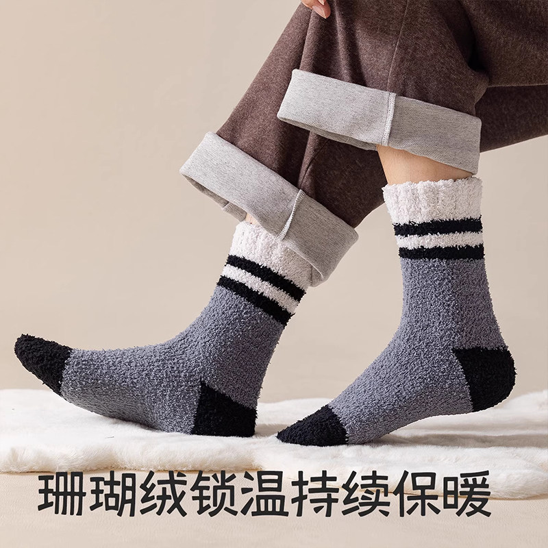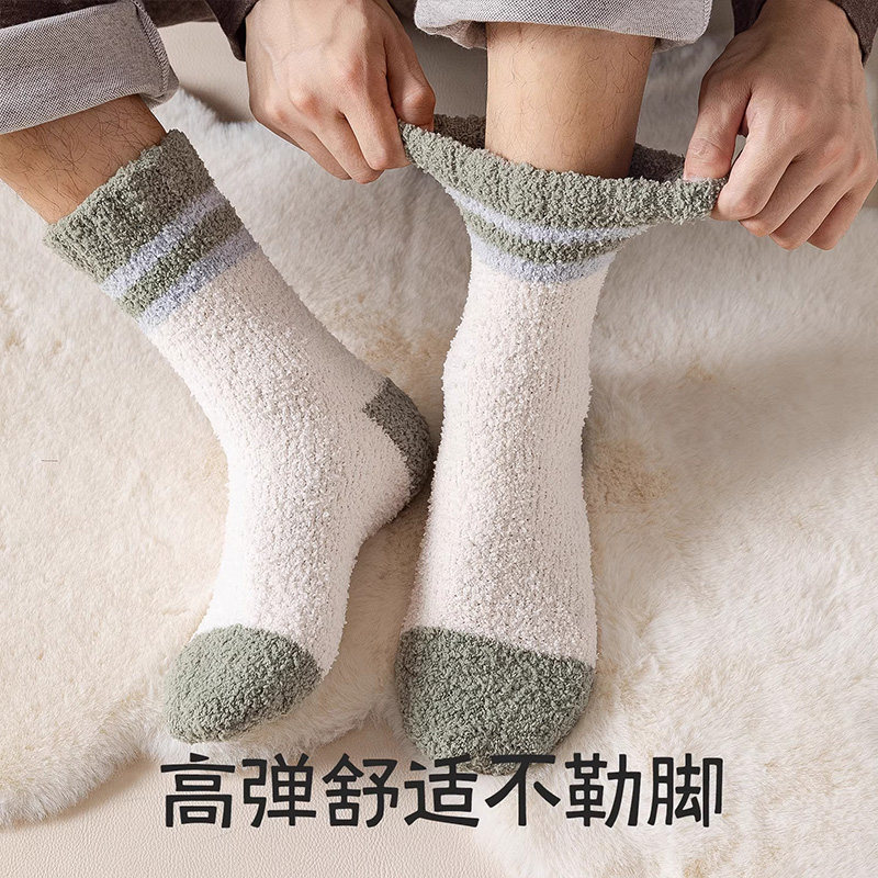 珊瑚绒袜子男款秋冬中筒袜加绒加厚仿羊毛地板袜男士居家长袜专业