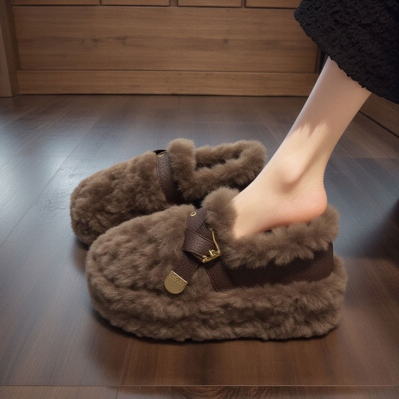 羊羔绒厚底毛毛鞋女2025年新款冬季皮带扣美拉德加绒保暖孕妇棉鞋