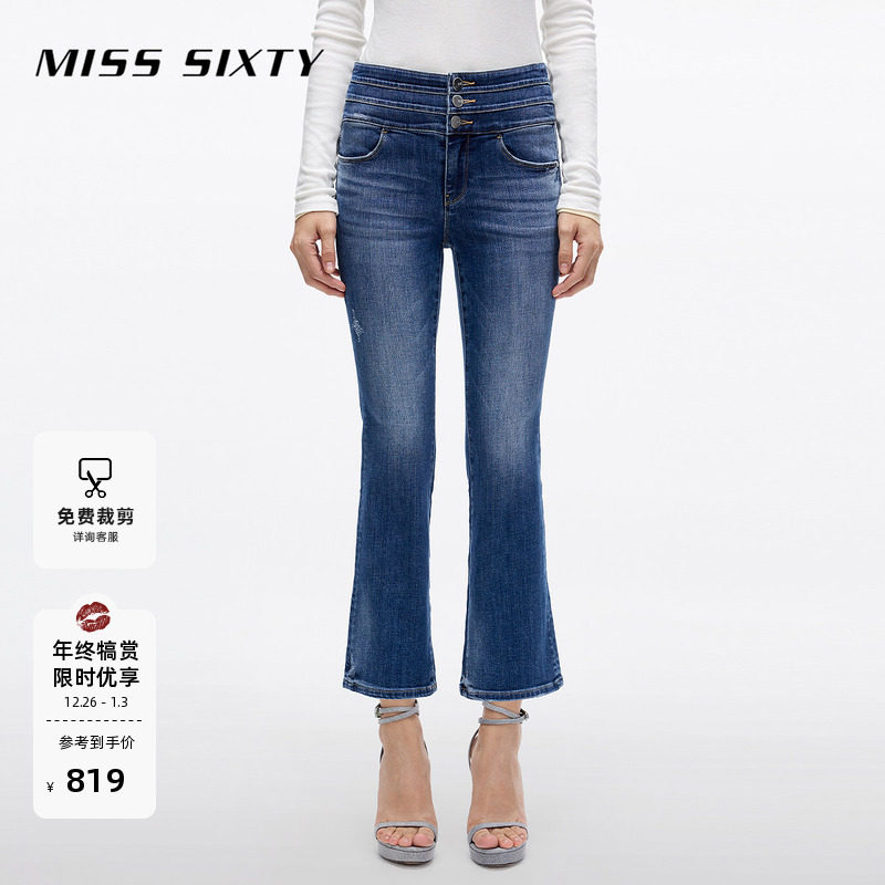 Miss Sixty25春秋款牛仔裤三环高腰微喇裤八分裤复古显瘦修身
