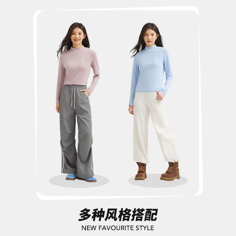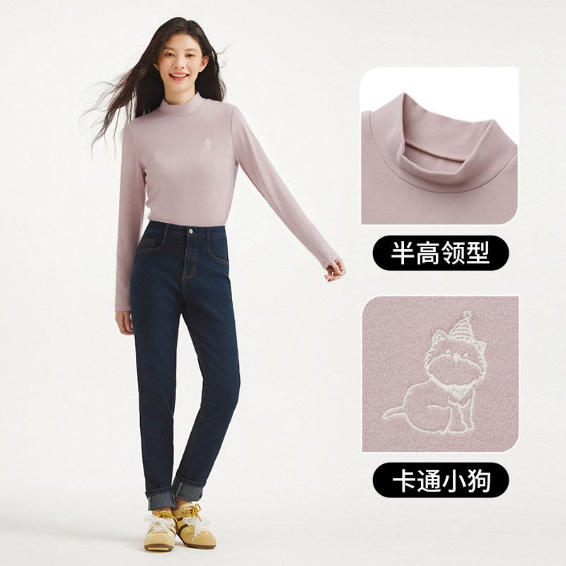 热风2025年冬季新款女士西高地刺绣半高领长T恤软糯亲肤打底衫
