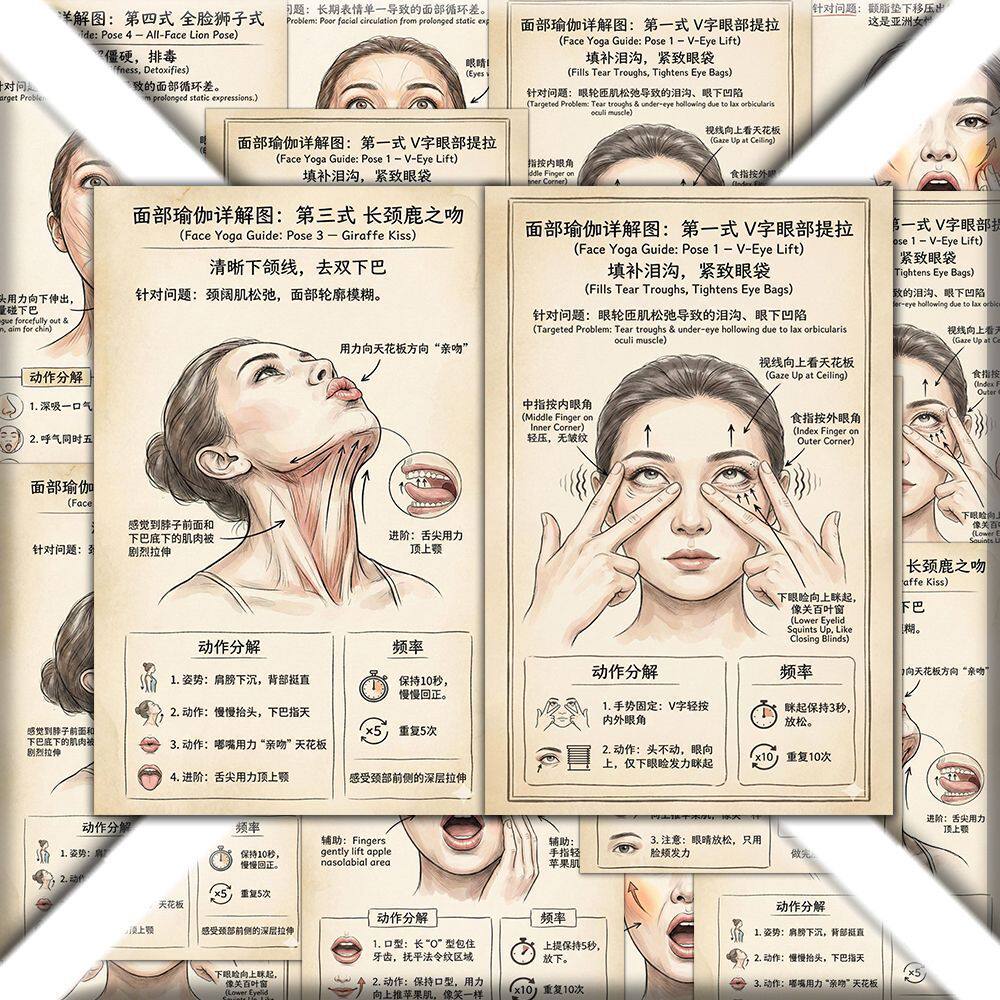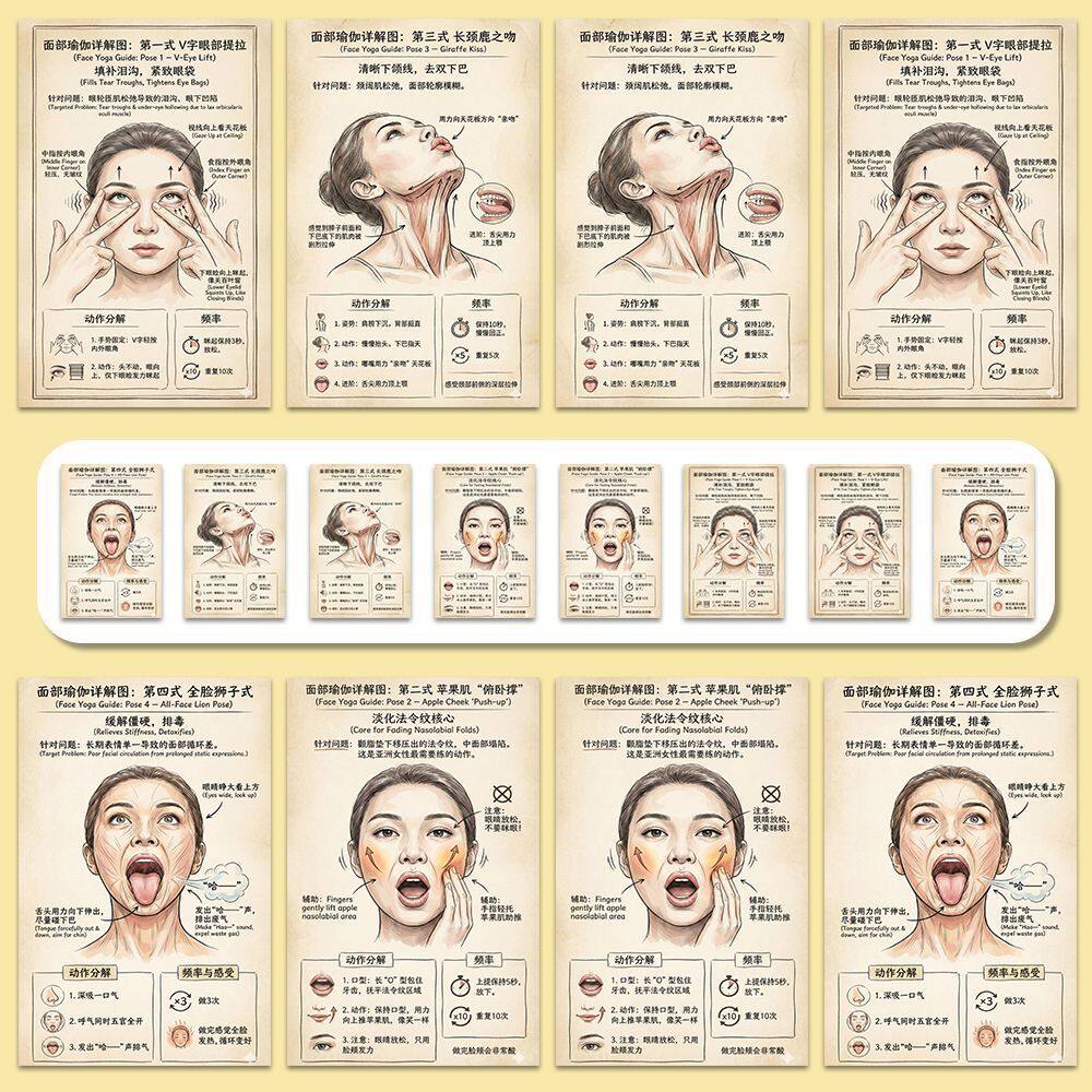 面部提升】面部瑜伽图解贴纸提升面部抗老清晰下颚线瘦脸紧致线贴