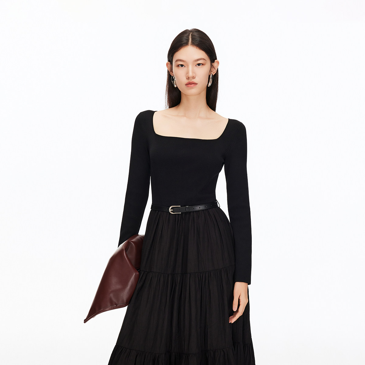 COCOBELLA简约气质黑色收腰极简风连衣裙女优雅短袖长裙FR3033-2