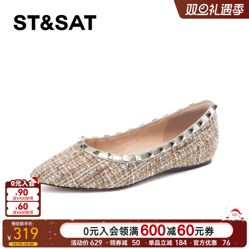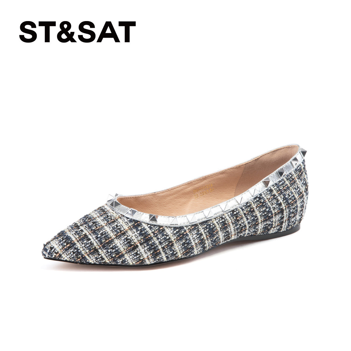 星期六尖头单鞋女春新款平底通勤浅口单鞋铆钉女鞋SS4111121A
