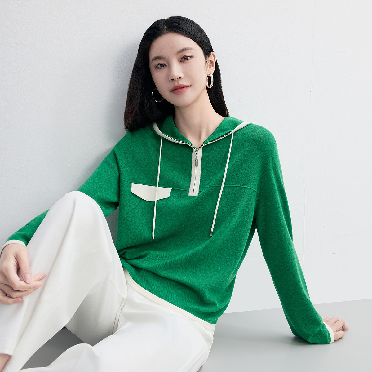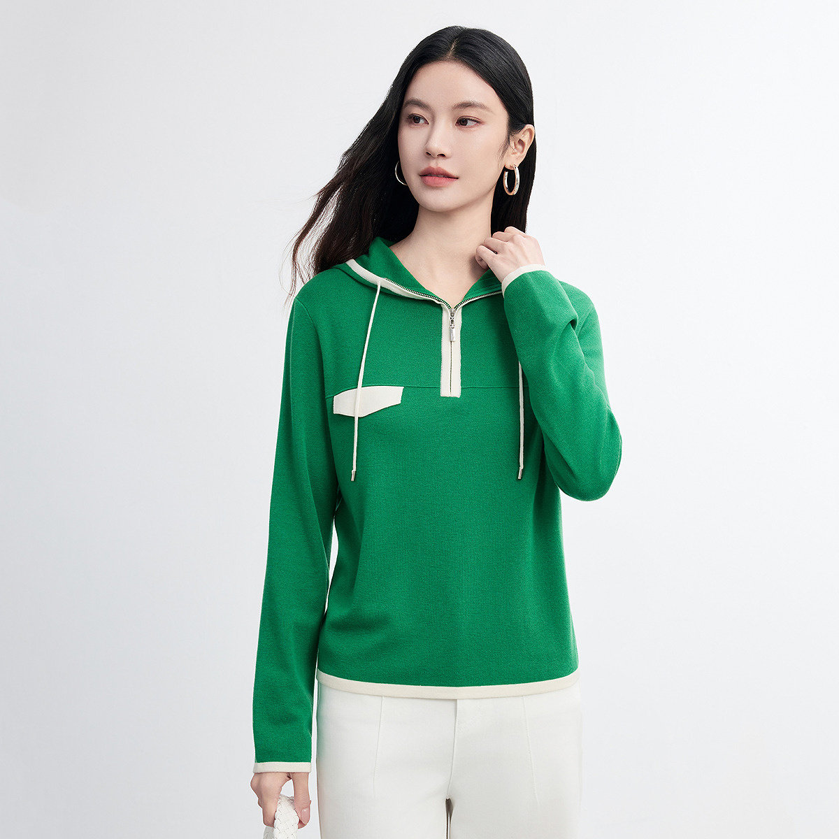 FINITY菲妮迪针织衫2026春新款绿色连帽撞色短款休闲羊毛衫上衣女