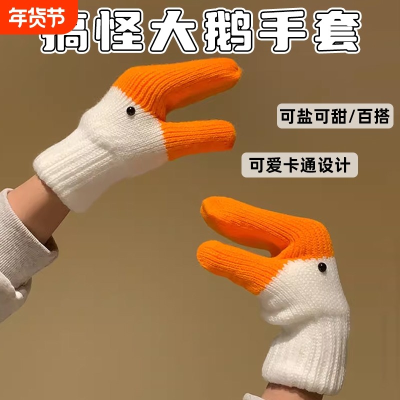 创意搞怪大鹅针织手套女秋冬季可爱连指保暖加绒加厚防寒鸭子防风
