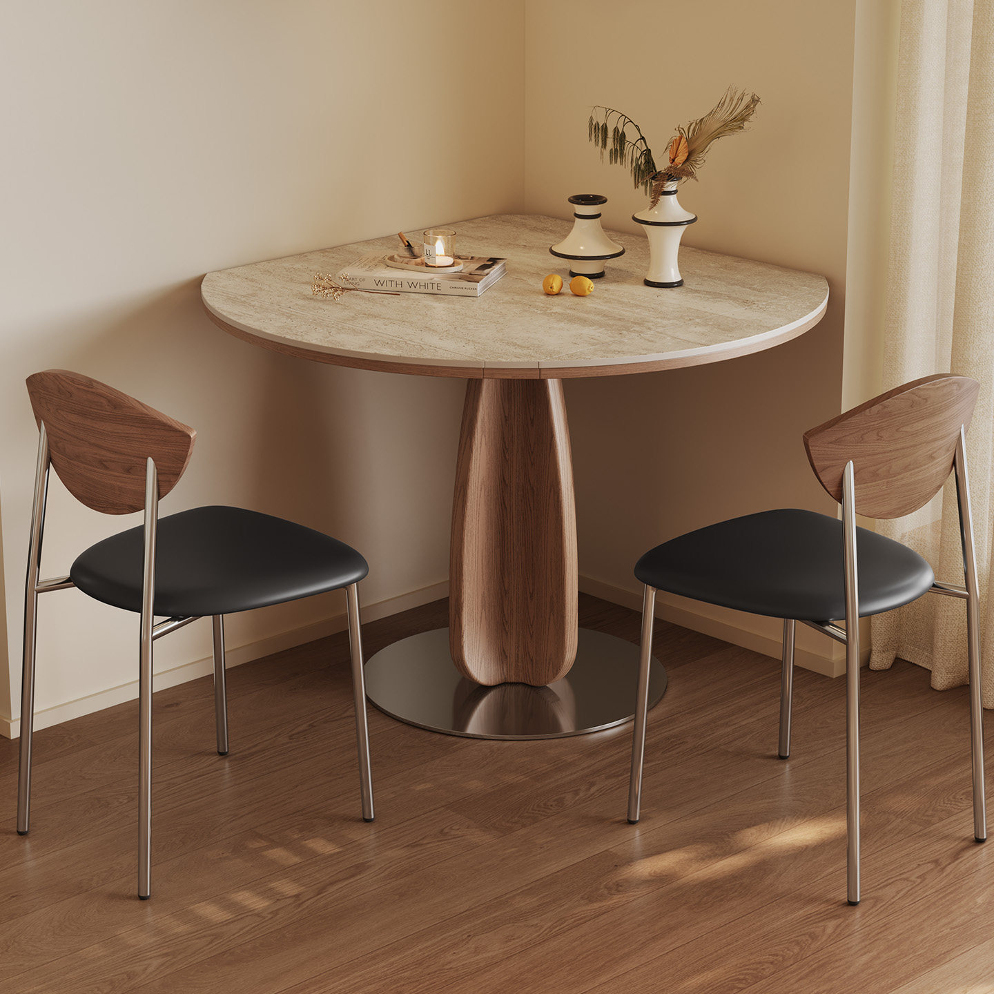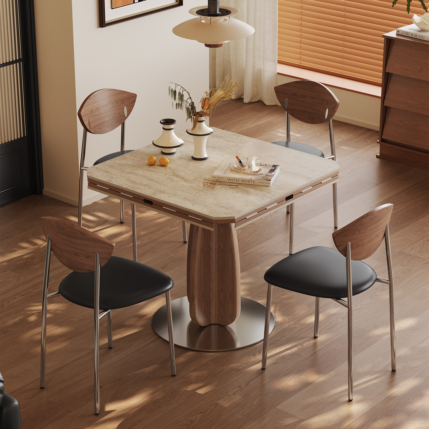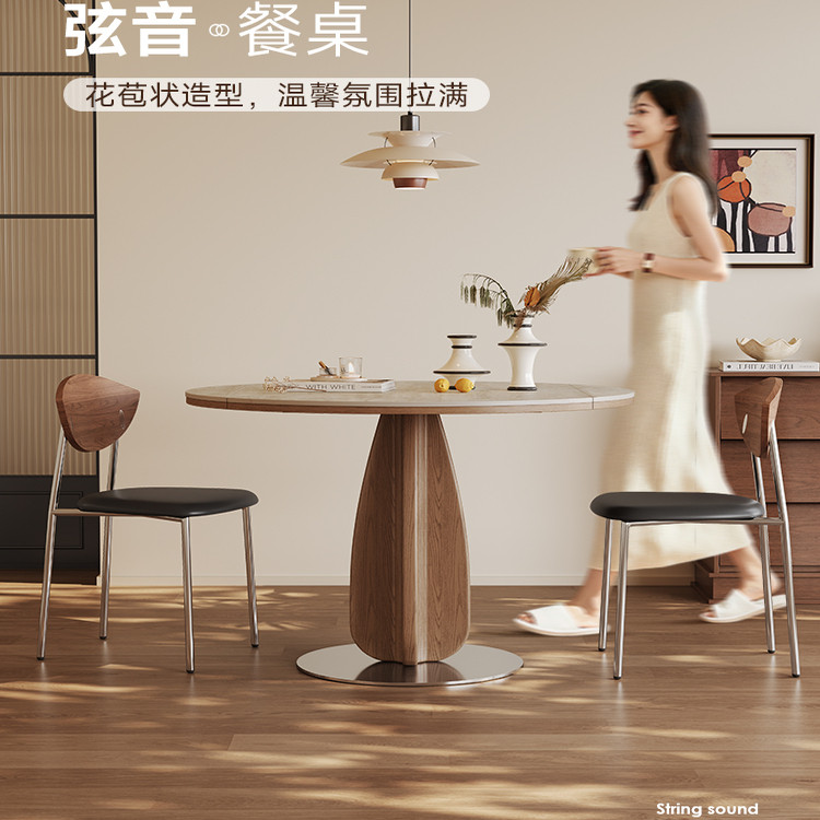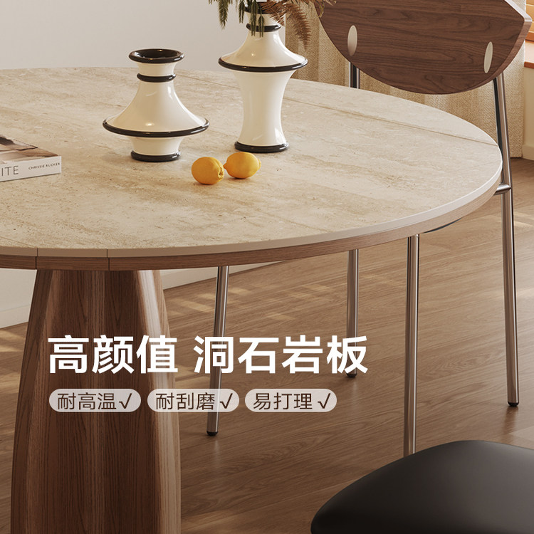 洞石岩板圆桌中古风2025新款家用小户型方圆两用可伸缩实木餐桌