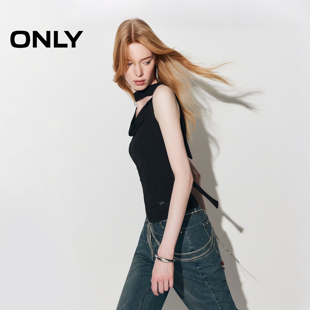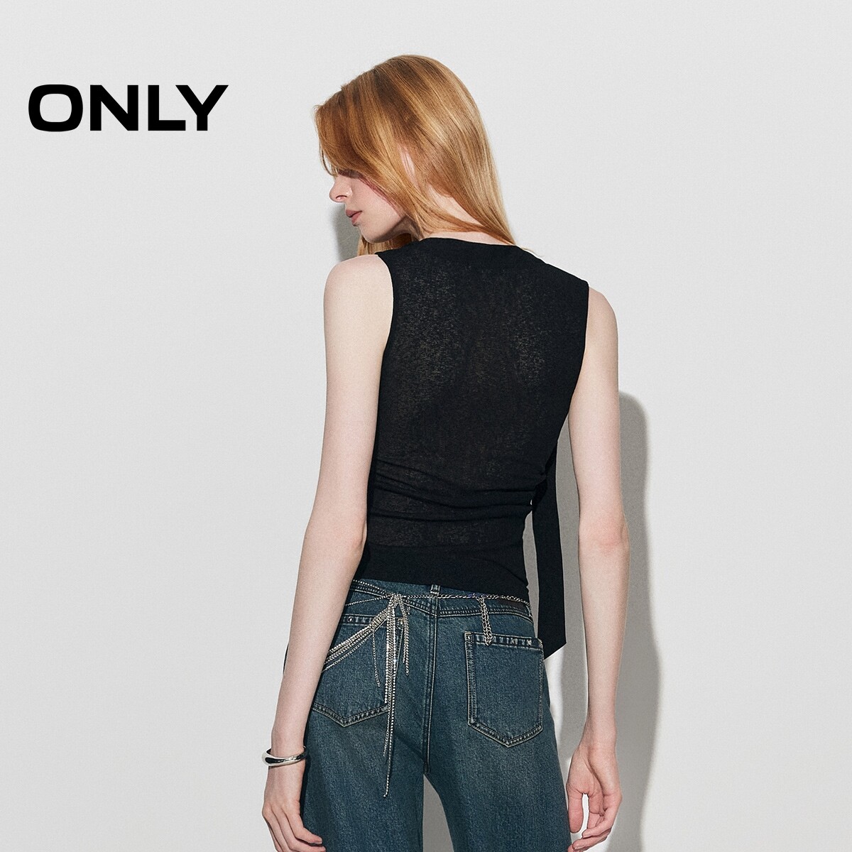 ONLY2026春季新款系带荡领收腰抽褶网纱透气黑色背心无袖上衣T恤
