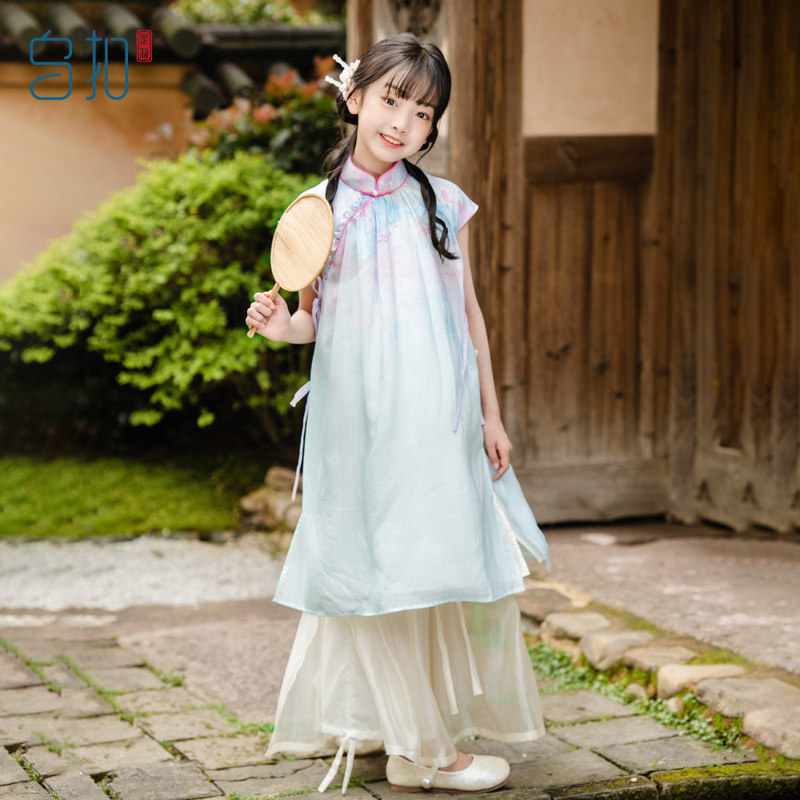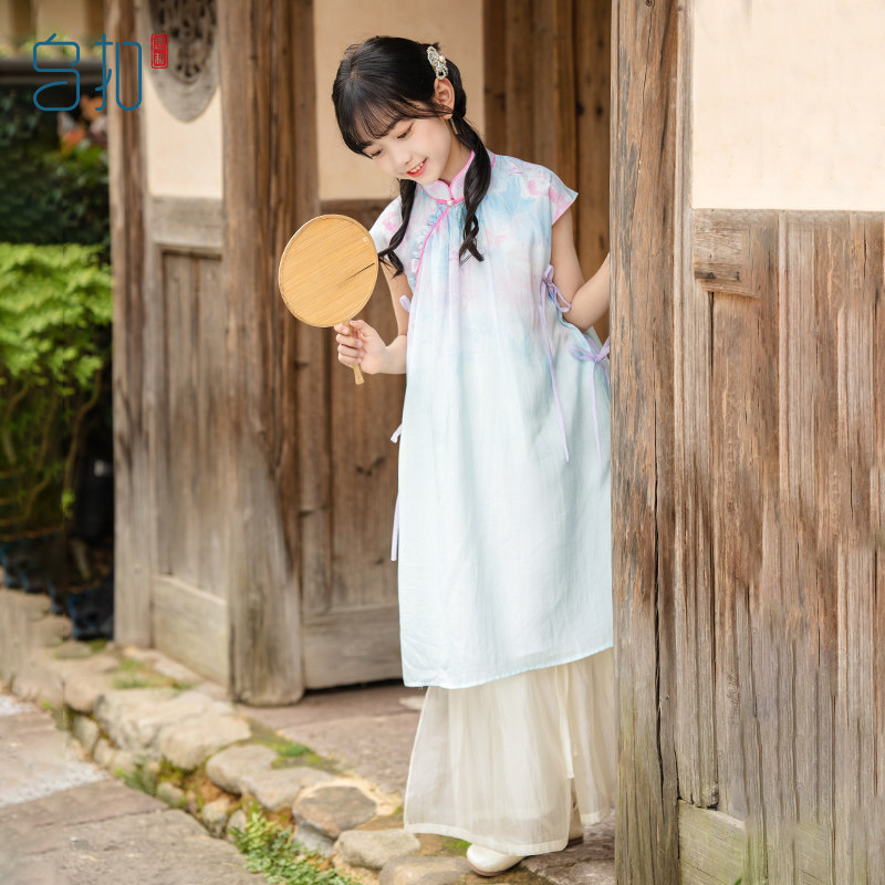 乌扣.茉知 女童旗袍新款夏季儿童中国风新中式古风夏装套装春夏