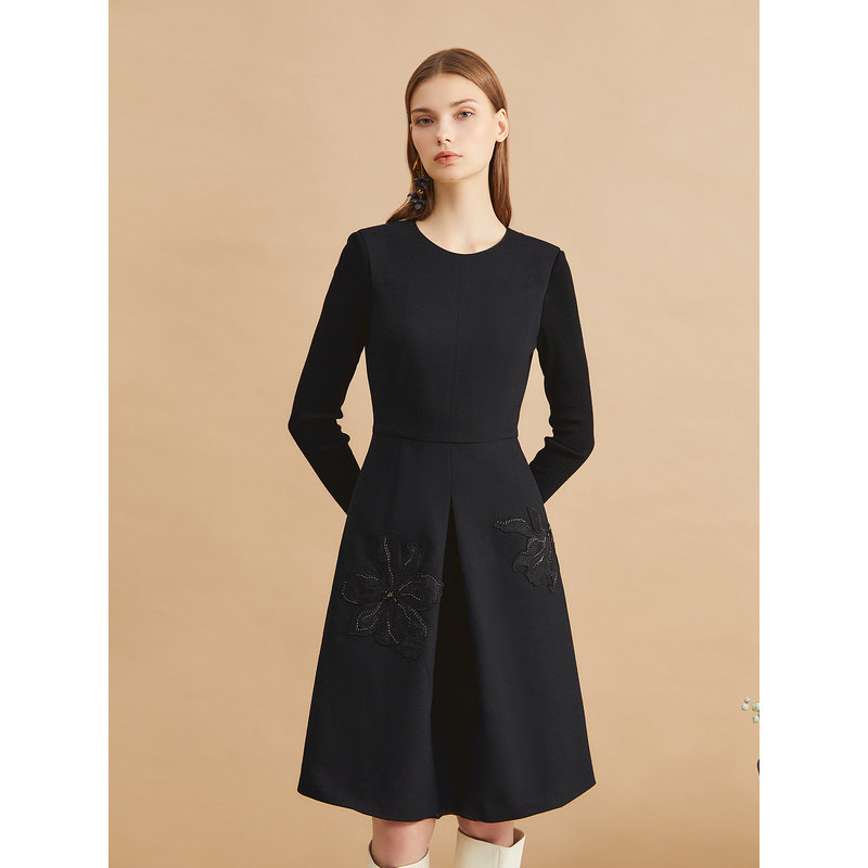 【木兰花系列】YINER音儿女装冬时尚美丽诺羊毛绣花小黑裙连衣裙