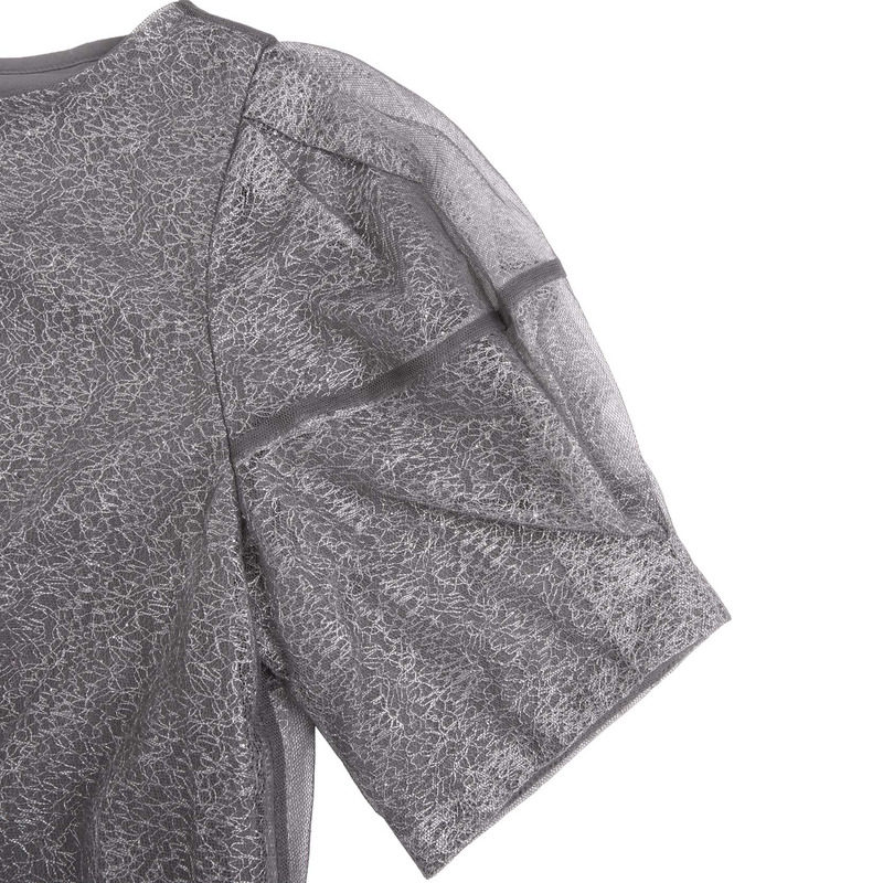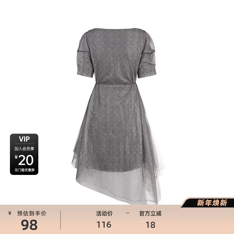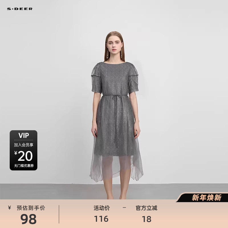 sdeer圣迪奥女装圆领肌理网纱收腰泡泡袖连衣裙S223Z12H2