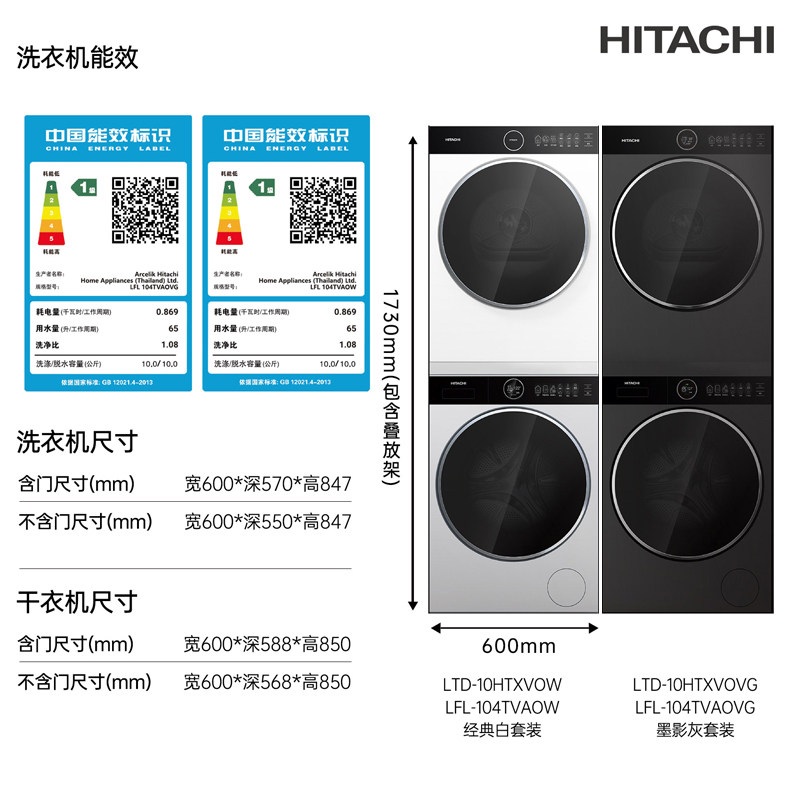 【日立新品轻岚】10KG超薄洗烘套装净氧洗衣机热泵干衣机除菌除螨