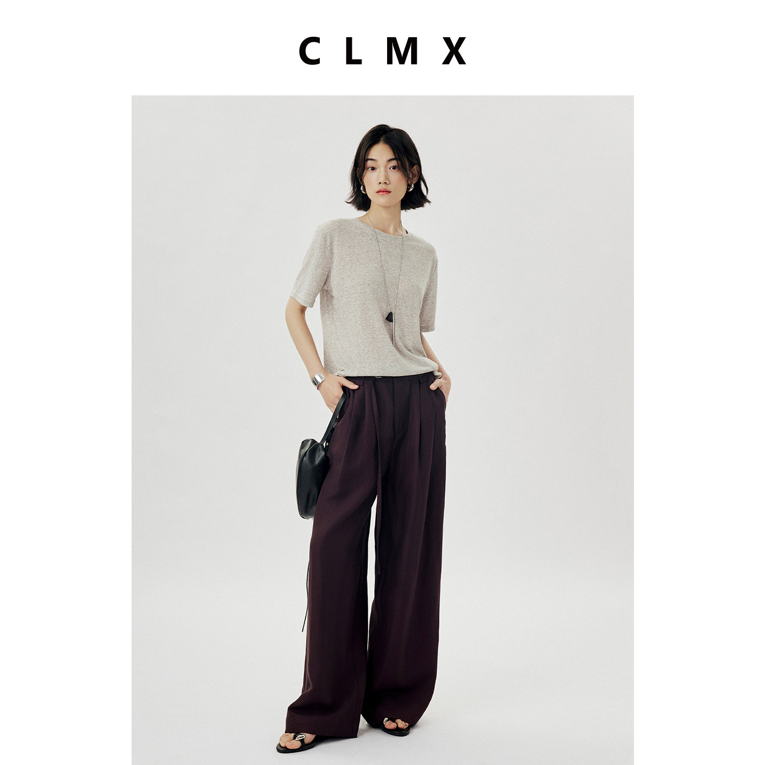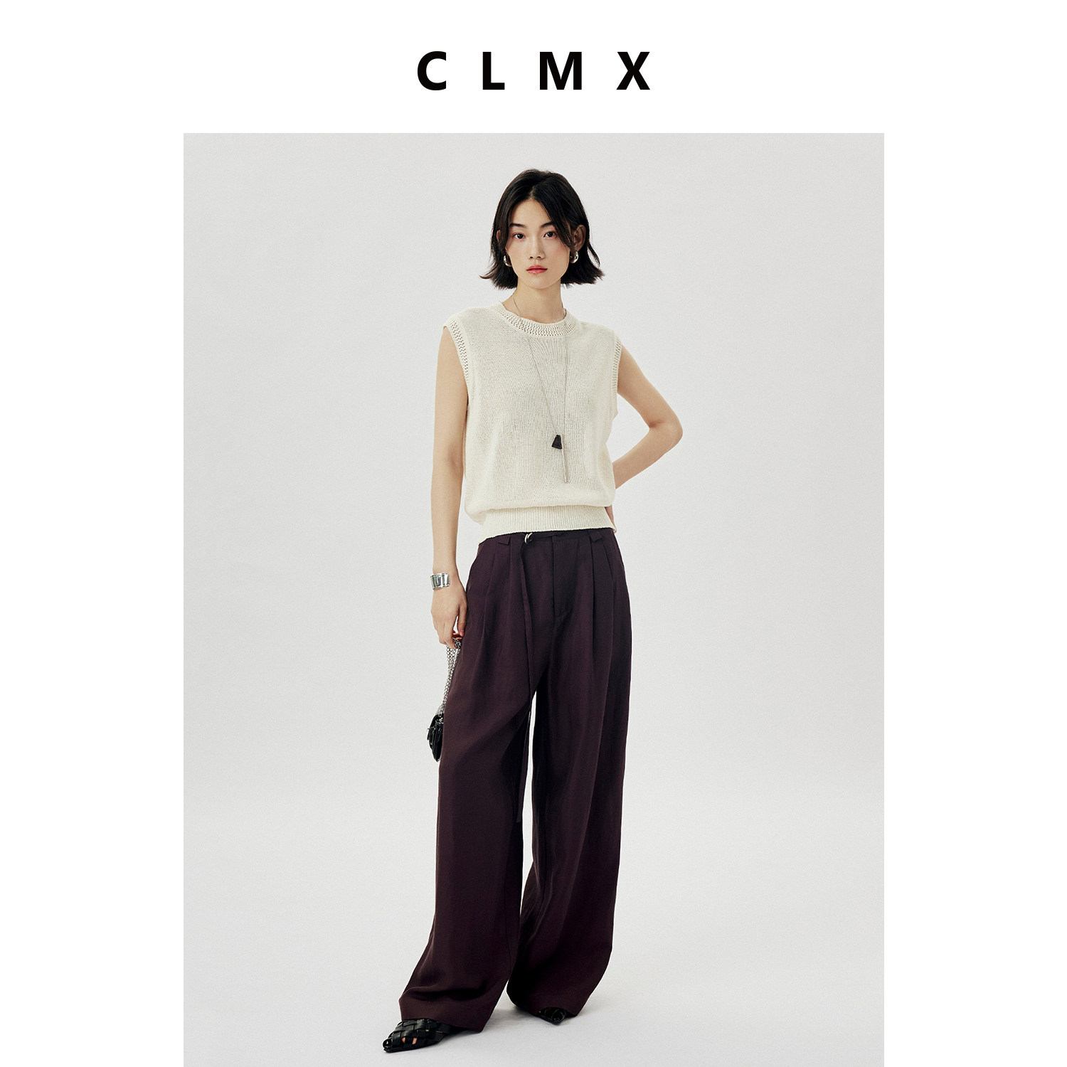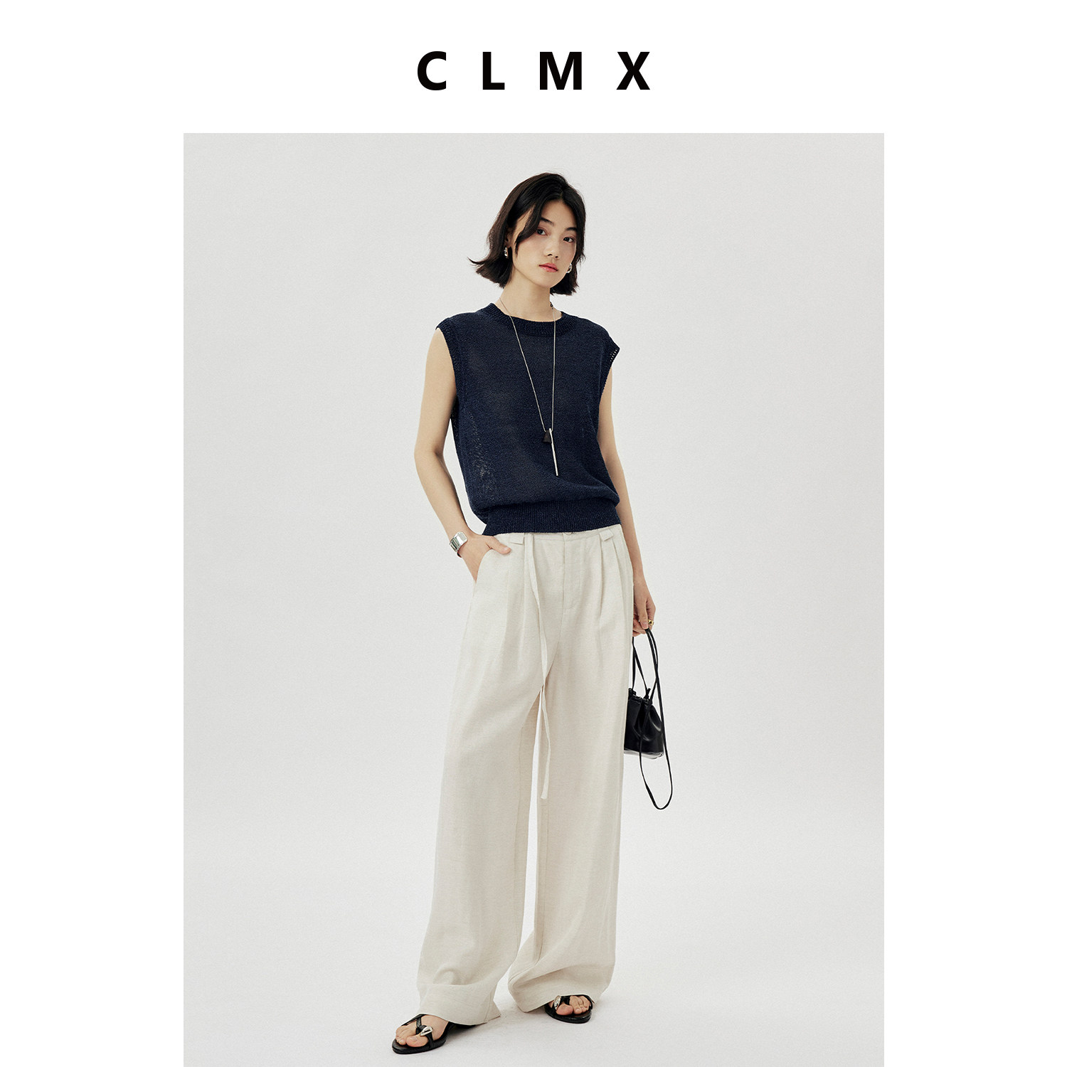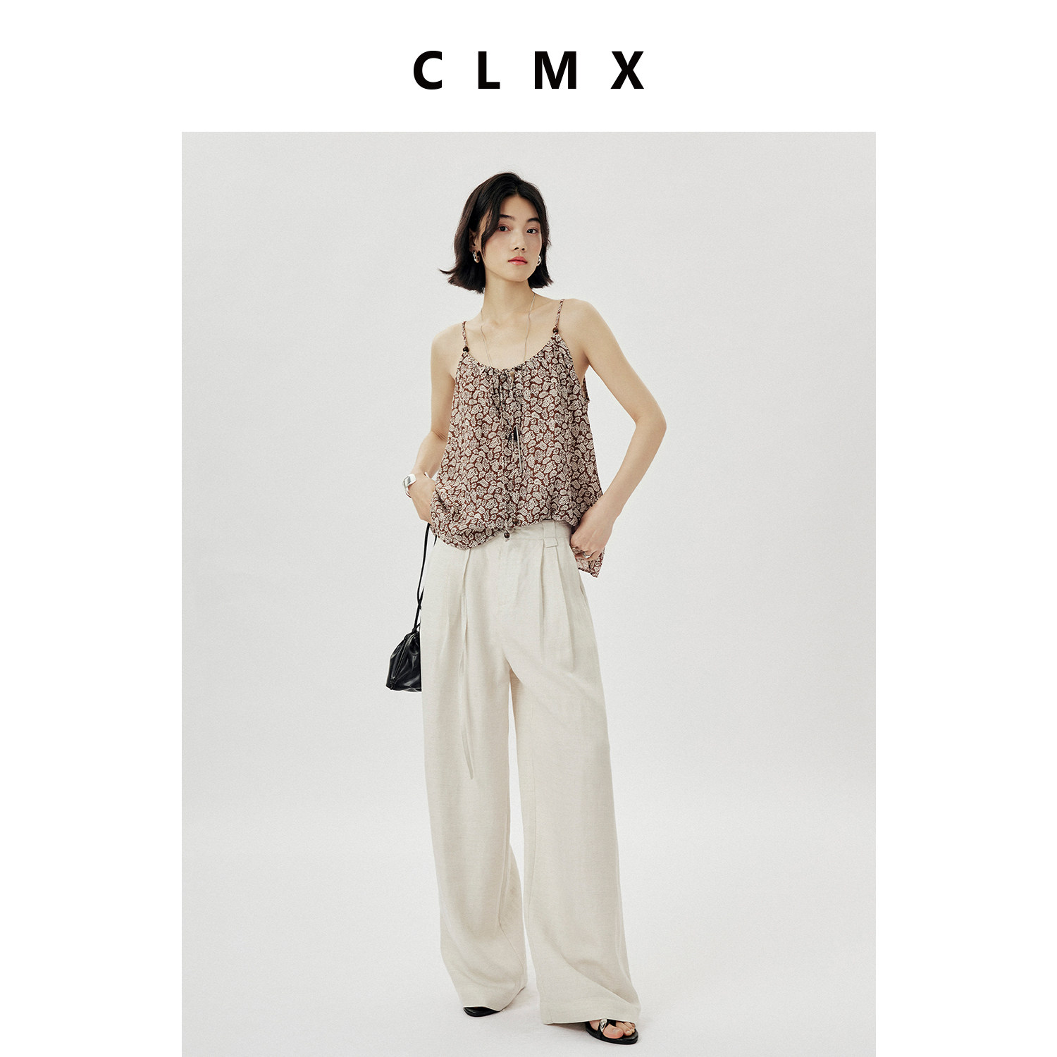 CLMX休闲舒适宽松阔腿裤子时装风十字纱结莱赛尔亚麻系腰带直筒裤