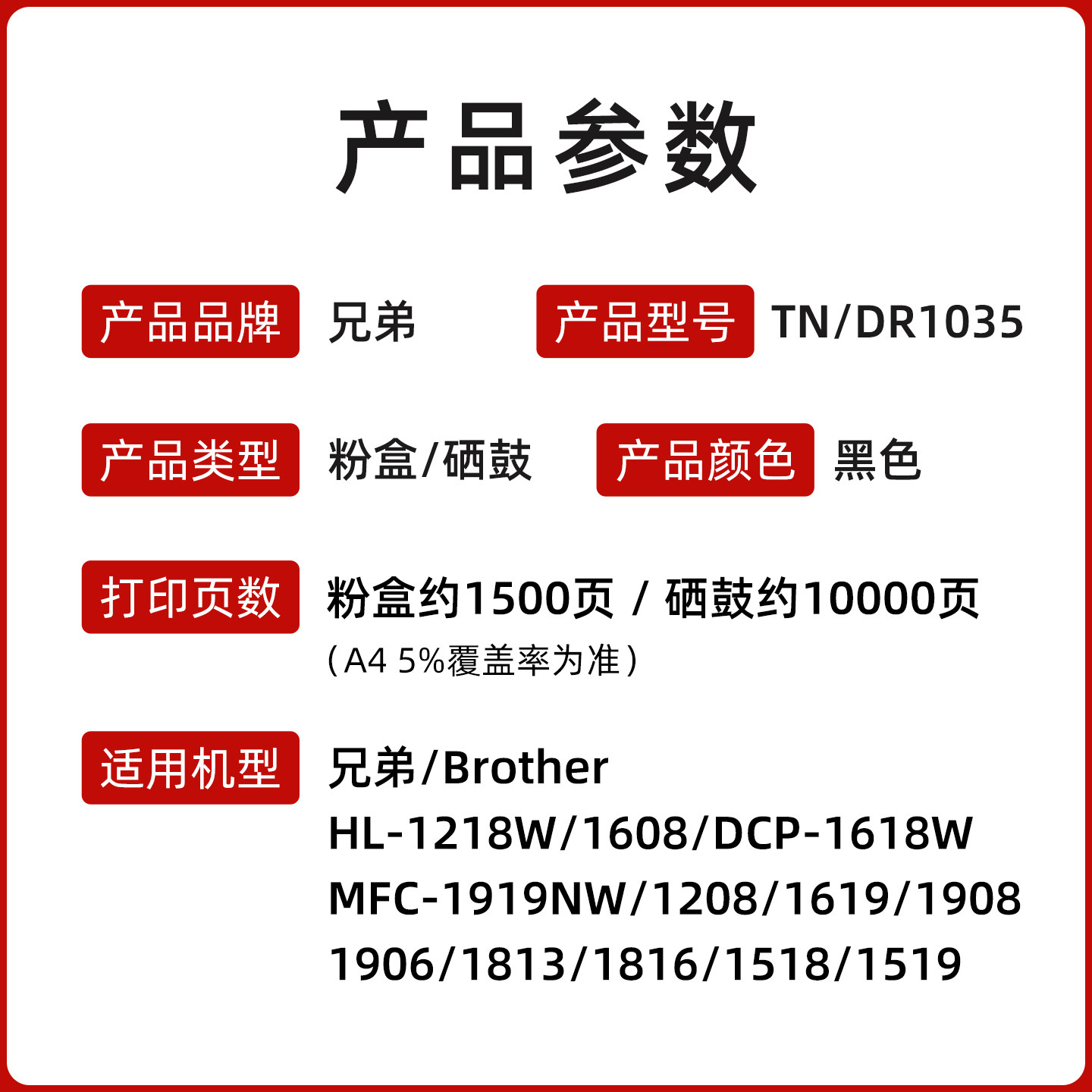 原装 兄弟1035粉盒 DCP-1608 1618W HL-1218W MFC-1919NW 1519 1908墨粉盒 墨盒Brother TN-1035兄弟1608硒鼓