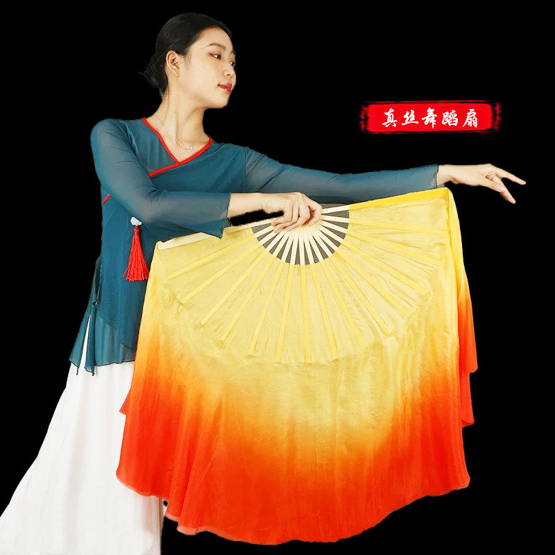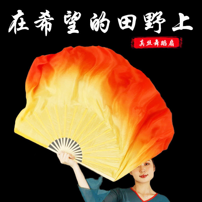 在希望的田野上黄橘渐变真丝双面舞蹈扇子胶州秧歌扇古典舞广场舞