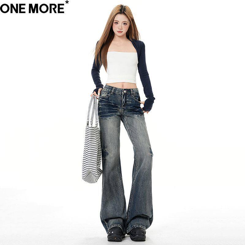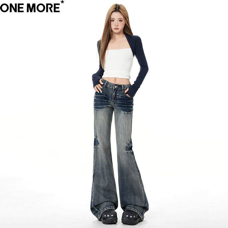 One More高街重工水洗微喇牛仔裤女2026春季新款猫须低腰喇叭裤子