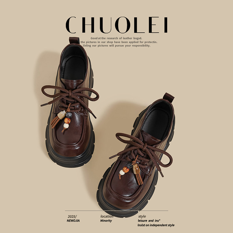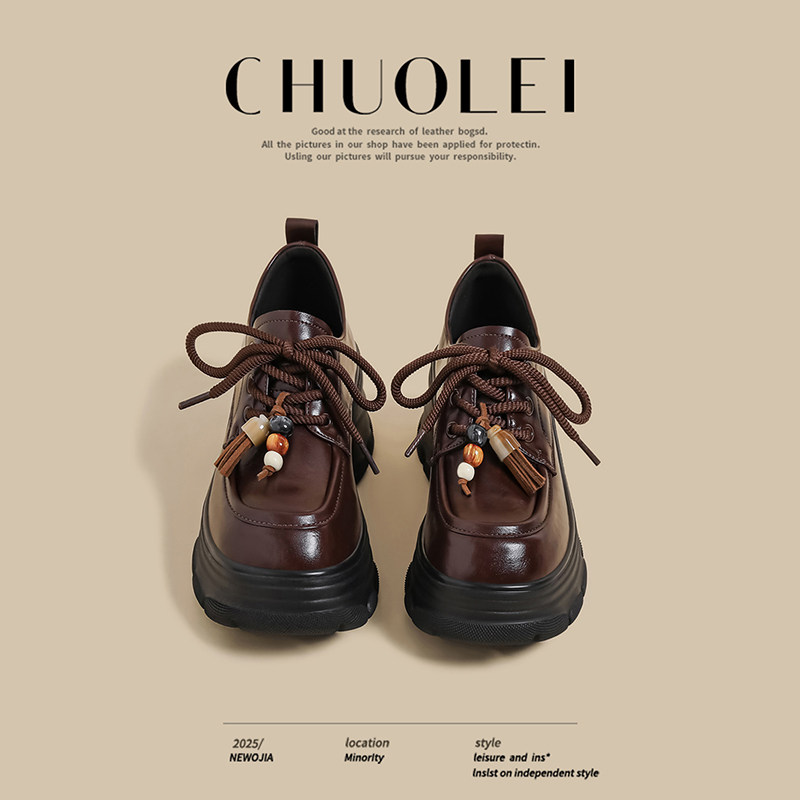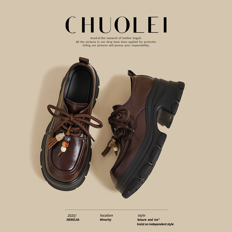 厚底增高跟英伦风小皮鞋女鞋子2025秋季棕色乐福鞋圆头粗跟绑带