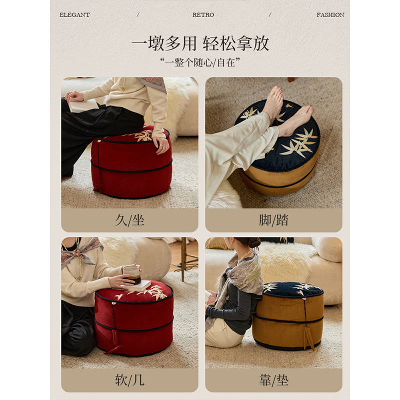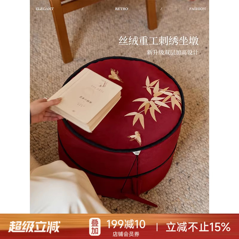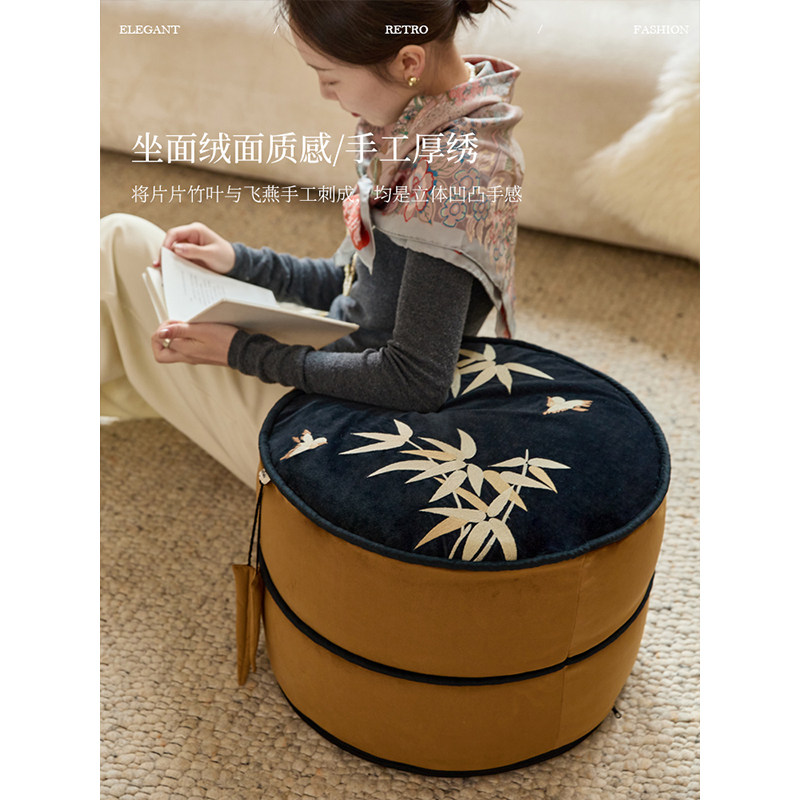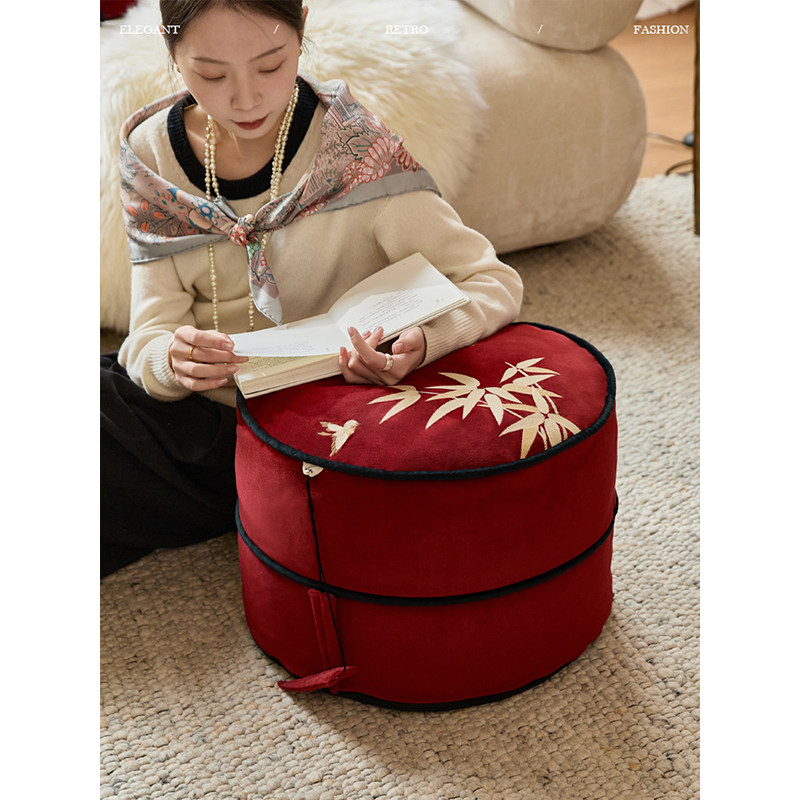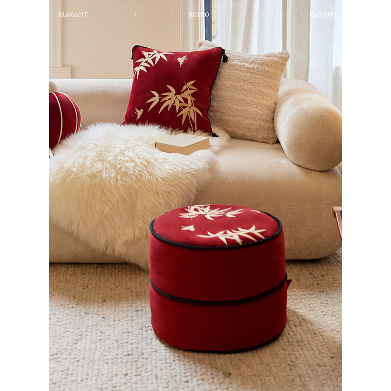 蜡笔派巴山竹夜竹节坐墩现代轻奢红色可拆洗换鞋凳刺绣蒲团坐垫