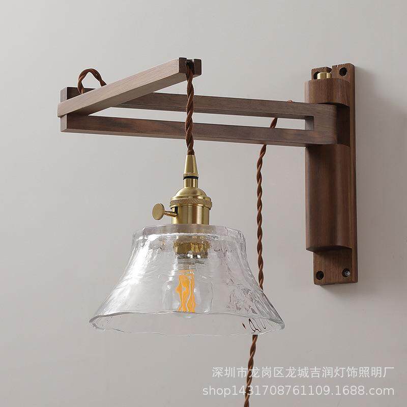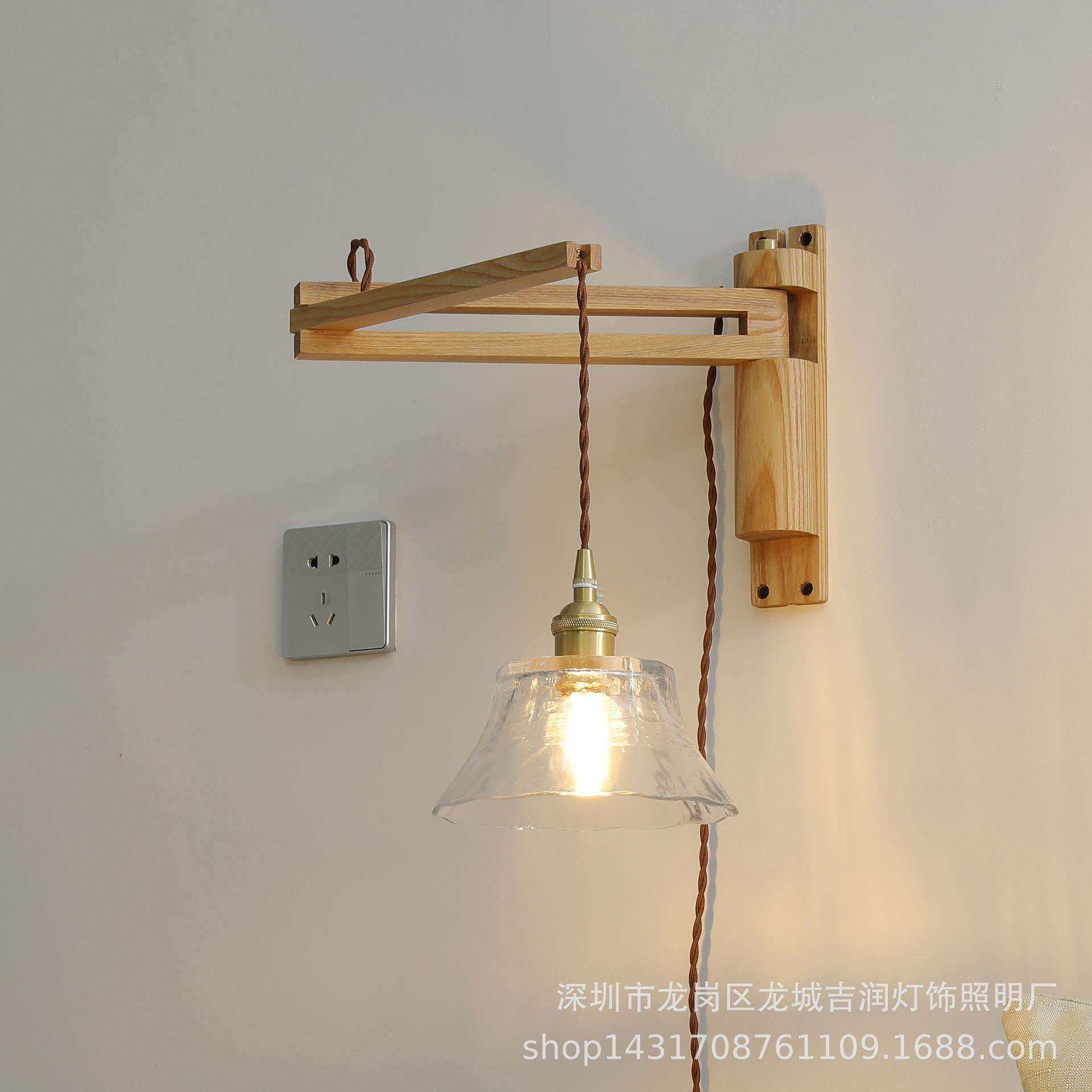 日式网红折叠复古客厅餐厅卧室胡桃木白蜡木免接线插头玻璃壁灯