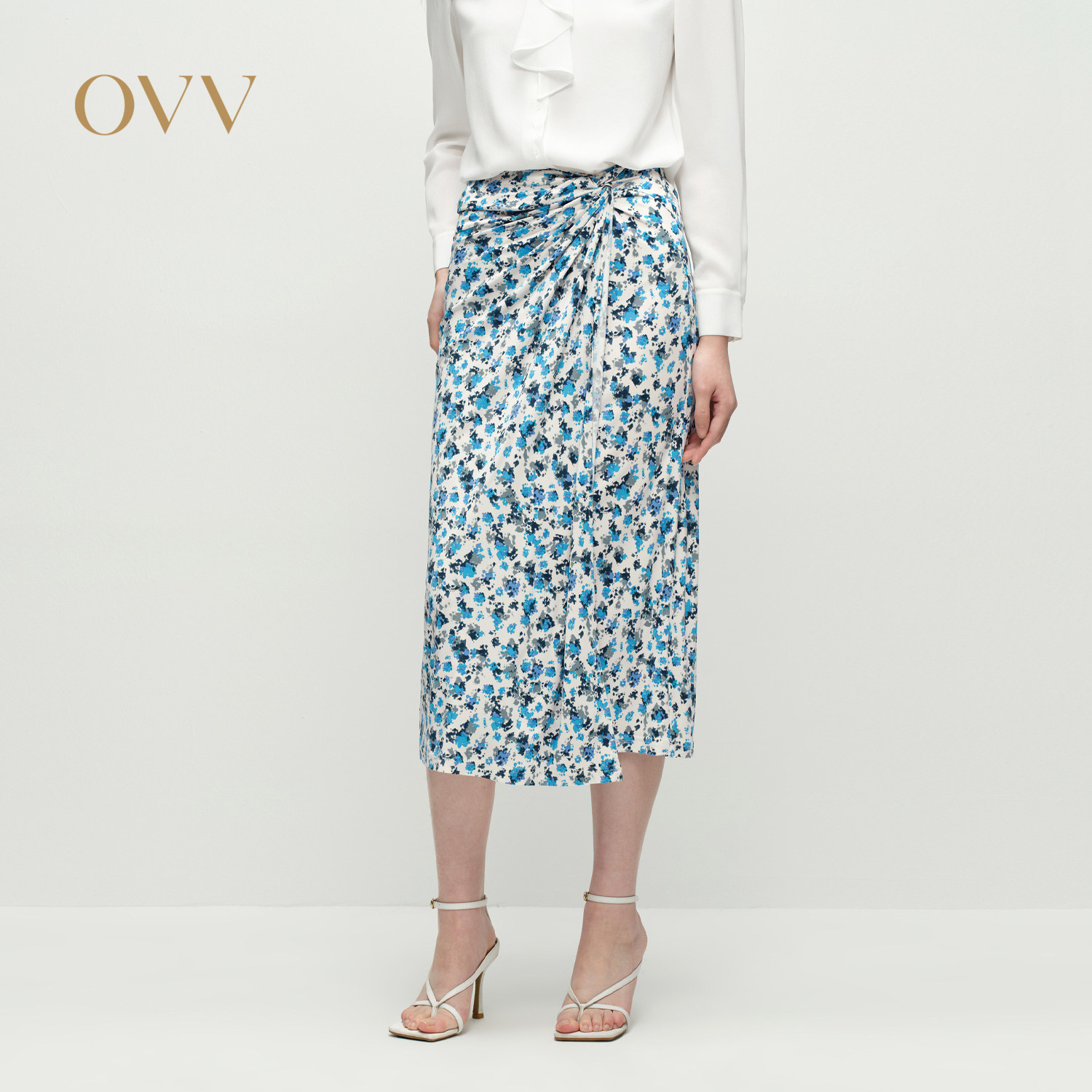 OVV2025春夏新款女装清爽印花扭结设计浪漫法式碎花半身裙