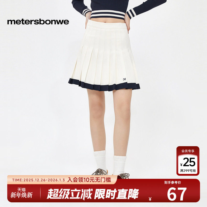 美特斯邦威半身裙女秋新款百搭舒适撞色拼接百褶裙显瘦短裙a字裙