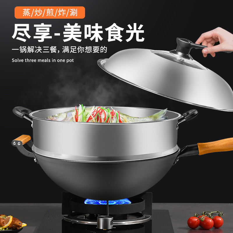 炊大皇铁锅家用无涂层不锈炒锅燃气灶专用炒锅炒菜锅平底锅极铁锅