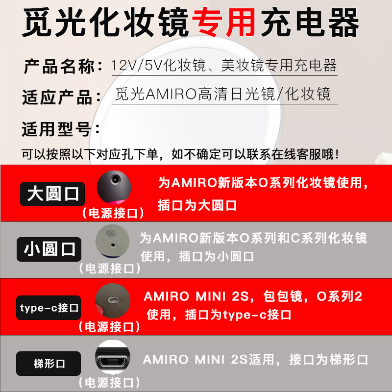 适用觅光AMIRO日光化妆镜充电线C/O系列2小黑镜魔方包包镜MINI 2S美化妆镜12V1充电源适配器USB数据线