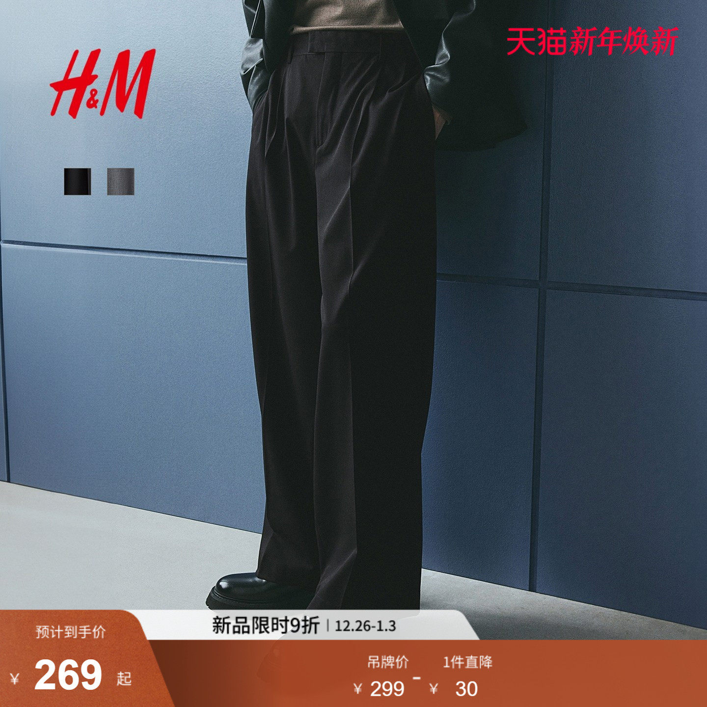 HM男装西裤2025冬季新款宽松柔软梭织直筒阔腿带烫折长裤1258152