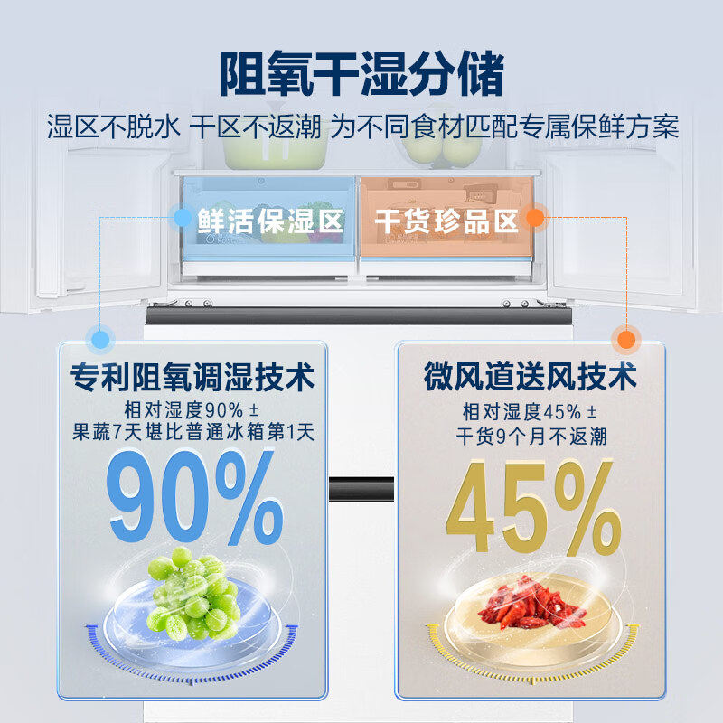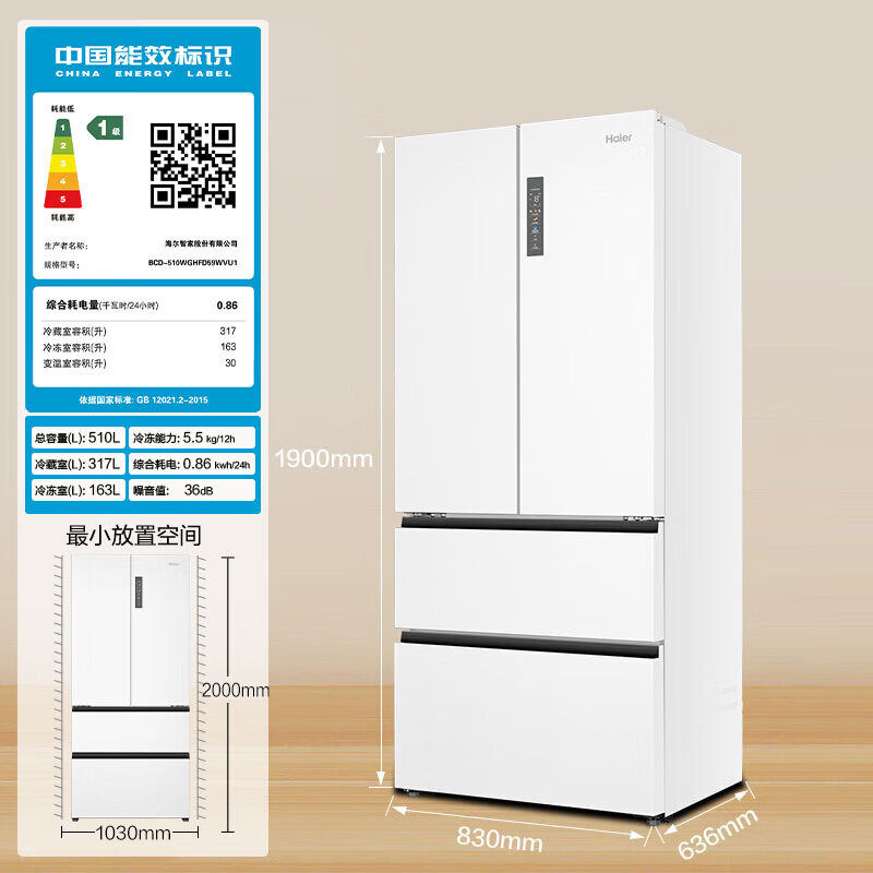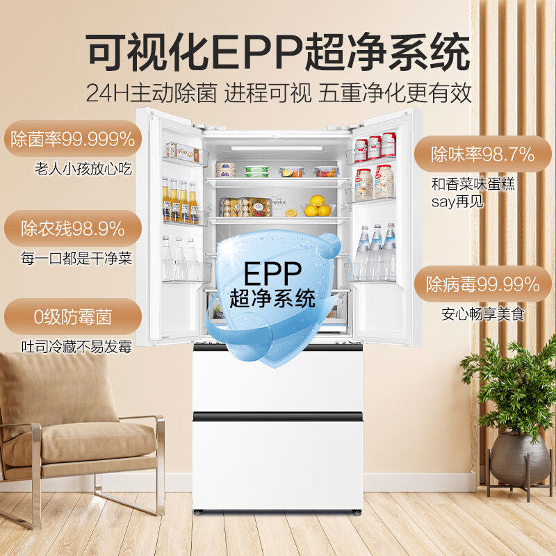 海尔510L法式多门四门超薄一级能效变频无霜白色风冷电子温控冰箱